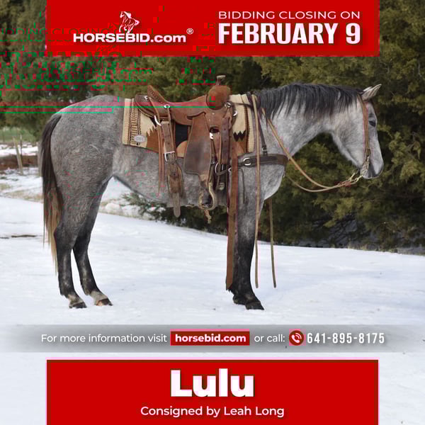 ❤️🔥𝑩𝒆 𝑴𝒊𝒏𝒆 𝐒𝐄𝐋𝐄𝐂𝐓❤️🔥 Happening now thru MONDAY | FEBRUARY 9th - Available EXCLUSIVELY on HorseBid's website! For more details and to register visit: www.Horsebid.com CONSIGNOR CONTACT: Leah Long 641-895-8175 LOCATION: Sulphur Springs, TX BREED: Qh REGISTERED: No REGISTERED NAME: lulu COLOR: Grey HEIGHT: 14 AGE: 4 GENDER: Mare ✨ Lulu – A Gentle, Well-Made Grey Mare with a Bright Future ✨ Lulu is a 4-year-old grade grey mare standing 14 hands tall and built right. She is well-made, balanced, and easy on the eyes, with a kind expression and a sensible demeanor that make her a pleasure to have around the barn. On the ground, Lulu is uncomplicated and well-mannered. She is easy to catch in the pasture, gets along well with other horses, and handles daily care with ease. She leads , loads and unloads without issue, ties, and bathes well. Lulu is respectful, calm, and genuinely easy to be around. Under saddle, Lulu is still green but has always been gentle and honest. She has never offered any funny business and tries to do exactly what is asked of her. She rides well outside and has been trail ridden extensively. Lulu has been ridden along the road and through town, and we have yet to find anything that truly bothers her. Passing cars, traffic, and new environments do not faze her, and she is accustomed to being around other farm animals. On the trail, Lulu confidently crosses anything put in front of her, including water, logs, and large ditches, doing so quietly and with ease. She stays level-headed, forward, and willing, making her a great candidate for someone wanting a young horse with a solid foundation and a great mind to continue bringing along. Due to her age and green status, Lulu is best suited for an intermediate rider who can continue her education, though her gentle nature makes her a very pleasant and forgiving ride. She is 100% sound and ready to step into a new program.