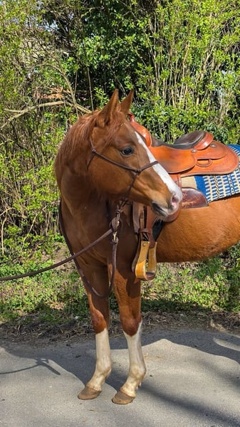 Spook N Honey - bildhübsche Jungstute, 2022 geboren mit einem geschätzten Endmaß von 150 cm, mit einem Charakter zum Dahinschmelzen. Sie kommt sofort wenn ihr Mensch auf die Weide kommt, lässt sich brav händeln und ist immer freundlich und aufgeschlossen. Die Stute durfte in Ruhe in einer kleinen Stutenherde im Offenstall aufwachsen. Kennt aber auch Box. Sie befindet sich in der Grundausbildung und ist leicht angeritten. 1- Jährig hat sie den Stadt&Dorf Trail gelassen gemeistert und 2 Jährig den Extrem Trail. Auch Anhängerfahren kennt sie und ist brav beim Tierarzt und Hufschmied. Honey weiß sich zu präsentieren. Eine vielseitige, liebe Partnerin, die sowohl im Sport als auch in der Freizeit begeistert wird!. Sie besitzt eine tolle Cutting/Allround Abstammung und wird mit vollen AQHA Papiere abgegeben. Eine klinische AKU wird im Rahmen des Verkaufes von der Züchterin in Auftrag gegeben. Ihr Preis steigt bei zunehmendem Ausbildungsstand.