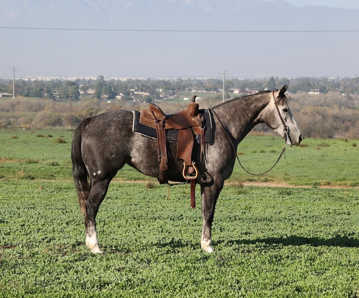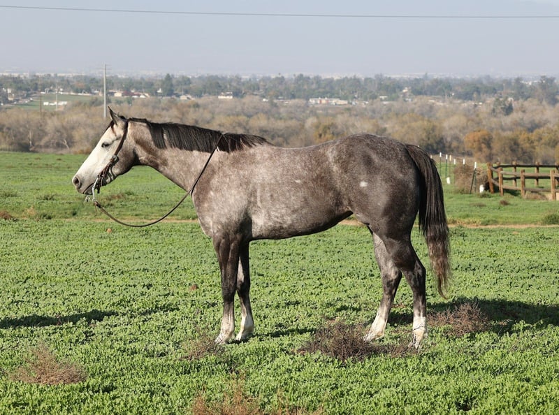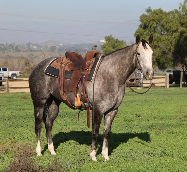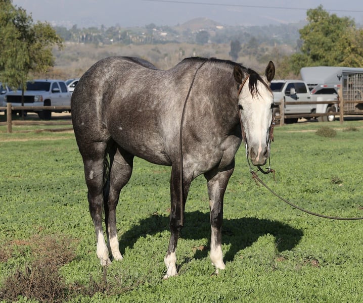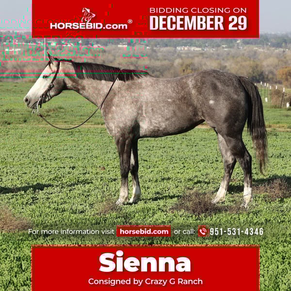 ⚜️𝐓𝐇𝐄 𝓗𝓮𝓻𝓲𝓽𝓪𝓰𝓮 𝐖𝐢𝐧𝐭𝐞𝐫 𝓒𝓵𝓪𝓼𝓼𝓲𝓬⚜️ Happening now thru MONDAY | DECEMBER 29th - Available EXCLUSIVELY on HorseBid's website! For more details and to register visit: www.Horsebid.com CONSIGNOR CONTACT: Crazy G Ranch 951-531-4346 LOCATION: Norco, CA BREED: Quarter horse REGISTERED: Yes REGISTERED NAME: Royalties Trickster COLOR: Dapple grey HEIGHT: 15.1 AGE: 3 GENDER: Mare Royalty’s Trickster 2022 Registered Quarter Horse Mare Barn Name: Sienna Color: Dapple Grey Royalty’s Trickster, known as Sienna, is a beautiful dapple grey Quarter Horse mare who is ready to continue her riding future. She lopes nice, consistent circles, rides well in the bridle, and has plenty of trail miles, making her confident and reliable in new situations. Sienna is not fully finished but would make an excellent prospect for a teenager or an intermediate rider and above. She has the athletic ability and versatility to excel as a jumper, rodeo prospect, or ranch horse. She has been ridden both western and English, is a true jump-on-and-go type, and does not require lunging. Sienna does not get fresh, even with time off. She has never offered to buck, rear, or bolt. Super personable and easy to be around, Sienna is not mare-ish and enjoys her job. A kind, willing mare with looks, brains, and a great attitude.