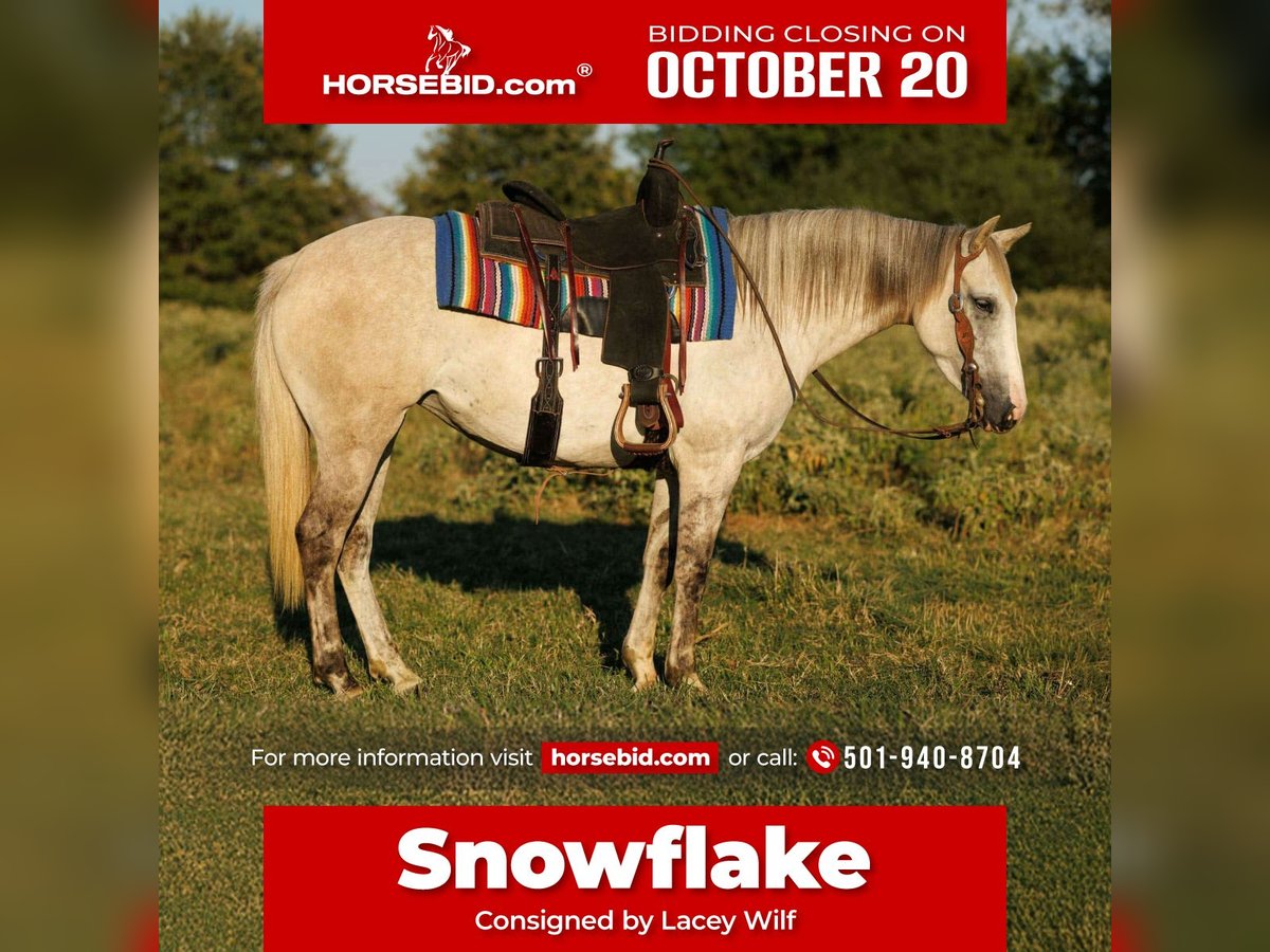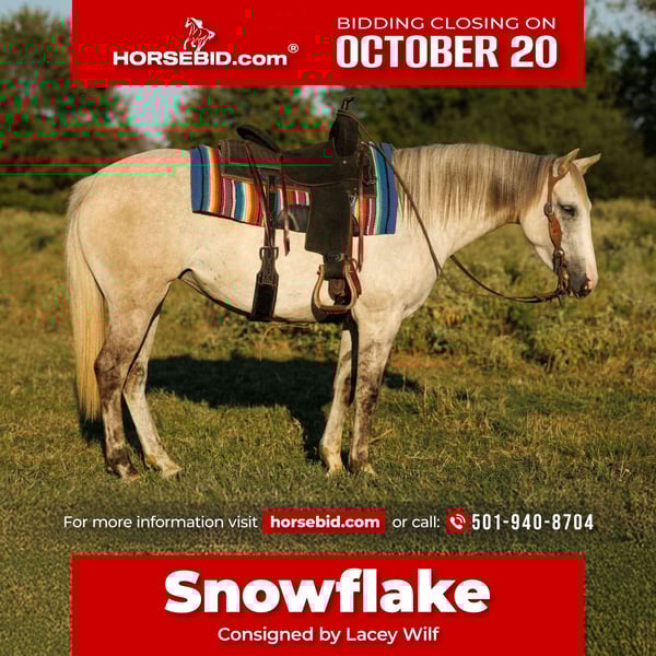♦️ 𝐭𝐡𝐞 𝐀𝐌𝐄𝐑𝐈𝐂𝐀𝐍 𝓕𝓪𝓵𝓵 𝓒𝓵𝓪𝓼𝓼𝓲𝓬 ♦️ Happening now thru MONDAY | OCTOBER 20th - Available EXCLUSIVELY on HorseBid's website! For more details and to register visit: www.Horsebid.com CONSIGNOR CONTACT: Lacey Wilf 501-940-8704 LOCATION: Quitman, AR BREED: Quarter Horse REGISTERED: No COLOR: Grey Dun HEIGHT: 14 AGE: 4 GENDER: Mare Snowflake is a four-year-old grey dun mare standing a handy 14 hands, and she’s every bit as striking as she is talented. With her soft grey coat, bold dorsal stripe, and tiger-striped legs, she has that classic dun factor that makes her stand out in any pen. She’s balanced, shapey, and feminine, with a bright, intelligent eye that reflects both style and sensibility. Despite her young age, Snowflake rides with a maturity well beyond her years. She crosses water and rough terrain without hesitation, catches both leads with ease, and stays soft and collected in the bridle. Her turnaround is snappy and her stop is deep and willing. She really wants to cat around — reading and following her rider with that catty, quick-footed feel. She even rides bridleless and bareback, proving her honesty and willingness no matter how you throw a leg over her. She’s been used at the sale barn, giving her valuable real-world exposure, and she watches a cow naturally and with plenty of feel. Easy to catch, saddle, bridle, haul, and handle, she’s as straightforward and user-friendly on the ground as she is in the saddle. There’s no fuss, no guesswork—just a filly who has the handle, knowledge, and try of a seasoned mount. She’s “really nice” doesn’t even do her justice; she’s downright exceptional. Snowflake is the full package: the kind of filly that’s sharp, stylish, and smart, yet quiet and trustworthy. At just four years old, she’s already the kind that can go in any direction — whether that’s the ranch, the arena, or the trail — and excel while looking good doing it. Willing, capable, and loaded with ability, Snowflake is a young mare with a bright future ahead of her.