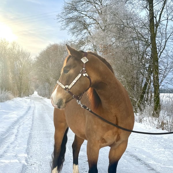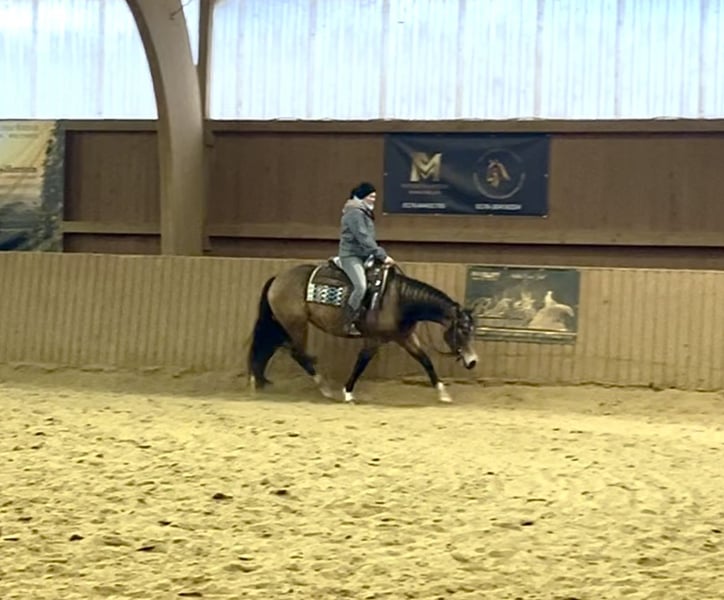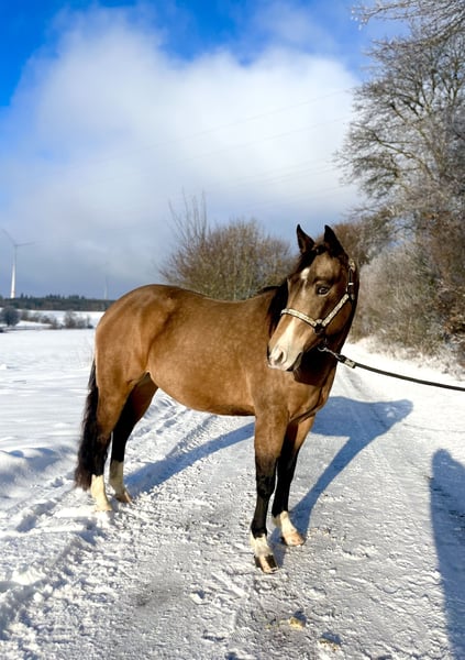 ⚜️ Gunna Spark Again ⚜️ 2021 QH Buckskin Stute 148 cm Panel Test n/ n und iMM ebenfalls n/n Bildschöne im QH Typ stehende Stute vom legendären Million Dollar Sire Gunner Dun It Again Aus einer direkten Steadys Dude Stute x Shining Spark. „Sparky“ ist im Umgang total unkompliziert - Sie ist leicht nachzureiten und auch für Anfänger / Jugendliche geeignet. Nach ihrer Grundausbildung kam sie zu den jetzigen Besitzern, die sie als reines Freizeitpferd genutzt haben. Sie hatten den Traum sie als Zuchtstute einzusetzen. Leider muss Sparky wegen schwerer Krankheit der Besitzer abgegeben werden. Ein gutes zu Hause steht für sie an erster Stelle. Sparky steht aktuell bei uns um sie Trainingstechnisch aufzufrischen und sie i.A . Zu verkaufen. Sie wünschen sich für Sparky ein zu Hause als Familienpferd für Freizeit /ambitionierten Freizeitreiter oder wegen ihrem Exzellenten Papier als Zuchtstute . Sie hat keine Reining Ausbildung ( Basics lernt sie gerade kennen ) Im Gelände ist sie noch unerfahren. Insgesamt ist sie Charakterlich Ein ruhiges Pferd, dass nicht jeden Tag laufen muss , sie fährt sich nicht hoch - sie hat absolut keine Unarten wie wegrennen / steigen / bocken und verzeiht Fehler des Reiters. Wenn sie sich erschreckt dann auf der Stelle. Wer ein Traumpferd mit Potential sucht zum weiter Ausbilden oder sie als Zuchtstute einsetzen will ist bei Sparky genau richtig. VIDEO : https://youtube.com/shorts/k7IXJ3j-8gY?si=hSeW5aqUMbeg0OuV Preis : 15.500€ vhb. Für ein Probereiten nehmen wir uns gerne Zeit und berechnen 40€ .