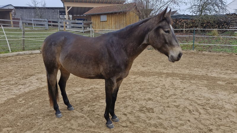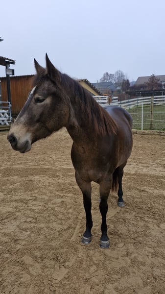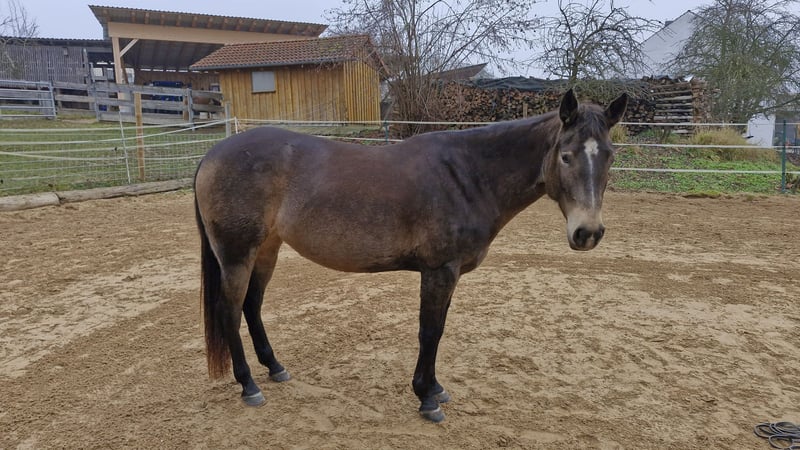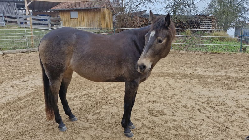 Miss Sinny Bar ist eine im Juni 2021 geborene buckskinfarbene Quarter Horse Stute mit einem Stockmaß von etwa 150 cm. Sie ist elegant, sportlich gebaut und gehört nicht zu den Gewichtsträgern, überzeugt aber durch ihre harmonische Entwicklung und ihre natürliche Athletik. Trotz eines angebrochenen Dornfortsatzes im Alter von zwei Jahren, der laut Tierarzt vollständig ausgeheilt ist, ist sie heute gesund, voll belastbar und wird regelmäßig geritten. Gerne kann der Tierarzt dazu befragt werden. Sie ist 5-Panel n/n über die Eltern, regelmäßig geimpft, entwurmt und zahnärztlich kontrolliert, läuft barhuf und war stets unter professioneller Sattelkontrolle. Aktuell lebt sie im Offenstall mit 24-Stunden-Heuversorgung und Weidegang und zeigt sich dort ranghoch innerhalb der Herde. Im Umgang ist sie ein sehr liebes, menschenbezogenes und verschmustes Pferd, das gleichzeitig willensstark, neugierig und manchmal etwas ungeduldig ist. Sie möchte immer gefallen, lernt schnell und zeigt viel Eifer sowie Offenheit für neue Aufgaben. Da sie noch viel hinterfragt und eine klare, faire Führung braucht, ist sie kein Anfängerpferd. Miss Sinny Bar wurde schonend und vielseitig nach dem Pro-Ride-Konzept ausgebildet. In der Halle läuft sie sicher in Schritt, Trab und Galopp und geht sowohl alleine als auch in der Gruppe zuverlässig ins Gelände. Besonders in der Freiarbeit sowie in der Boden- und Longenarbeit zeigt sie großes Talent. Durch ihre sehr gute Reining-Abstammung (Einsteins Revolution x Bueno Swiss Doc) ist sie nicht nur als Nachwuchspferd für ambitionierte Freizeitreiter interessant, sondern perspektivisch auch für die Zucht. Der passende Sattel kann auf Wunsch mit erworben werden. Da es sich um keinen Notverkauf handelt, wird großer Wert auf ein geeignetes Zuhause gelegt, in dem diese talentierte Stute weiter gefördert und abwechslungsreich beschäftigt wird. Miss Sinny Bar bringt alles mit, was man sich von einem jungen, motivierten Pferd wünscht, das gemeinsam mit seinem Menschen wachsen möchte.