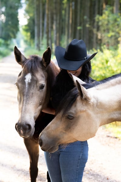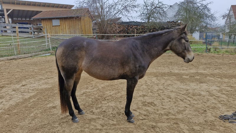 Miss Sinny Bar ist eine im Juni 2021 geborene buckskinfarbene Quarter Horse Stute mit einem Stockmaß von etwa 150 cm. Sie ist elegant, sportlich gebaut und gehört nicht zu den Gewichtsträgern, überzeugt aber durch ihre harmonische Entwicklung und ihre natürliche Athletik. Trotz eines angebrochenen Dornfortsatzes im Alter von zwei Jahren, der laut Tierarzt vollständig ausgeheilt ist, ist sie heute gesund, voll belastbar und wird regelmäßig geritten. Gerne kann der Tierarzt dazu befragt werden. Sie ist 5-Panel n/n über die Eltern, regelmäßig geimpft, entwurmt und zahnärztlich kontrolliert, läuft barhuf und war stets unter professioneller Sattelkontrolle. Aktuell lebt sie im Offenstall mit 24-Stunden-Heuversorgung und Weidegang und zeigt sich dort ranghoch innerhalb der Herde. Im Umgang ist sie ein sehr liebes, menschenbezogenes und verschmustes Pferd, das gleichzeitig willensstark, neugierig und manchmal etwas ungeduldig ist. Sie möchte immer gefallen, lernt schnell und zeigt viel Eifer sowie Offenheit für neue Aufgaben. Da sie noch viel hinterfragt und eine klare, faire Führung braucht, ist sie kein Anfängerpferd. Miss Sinny Bar wurde schonend und vielseitig nach dem Pro-Ride-Konzept ausgebildet. In der Halle läuft sie sicher in Schritt, Trab und Galopp und geht sowohl alleine als auch in der Gruppe zuverlässig ins Gelände. Besonders in der Freiarbeit sowie in der Boden- und Longenarbeit zeigt sie großes Talent. Durch ihre sehr gute Reining-Abstammung (Einsteins Revolution x Bueno Swiss Doc) ist sie nicht nur als Nachwuchspferd für ambitionierte Freizeitreiter interessant, sondern perspektivisch auch für die Zucht. Der passende Sattel kann auf Wunsch mit erworben werden. Da es sich um keinen Notverkauf handelt, wird großer Wert auf ein geeignetes Zuhause gelegt, in dem diese talentierte Stute weiter gefördert und abwechslungsreich beschäftigt wird. Miss Sinny Bar bringt alles mit, was man sich von einem jungen, motivierten Pferd wünscht, das gemeinsam mit seinem Menschen wachsen möchte.