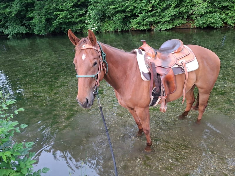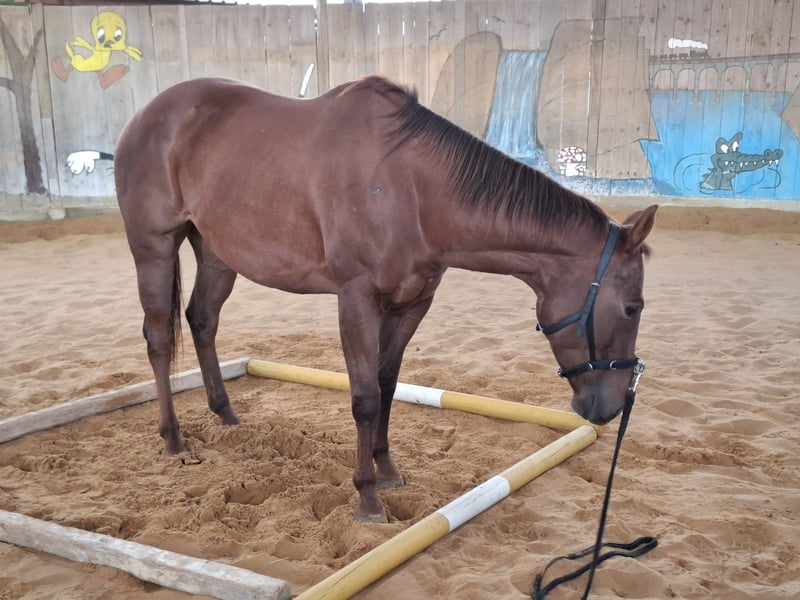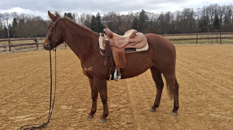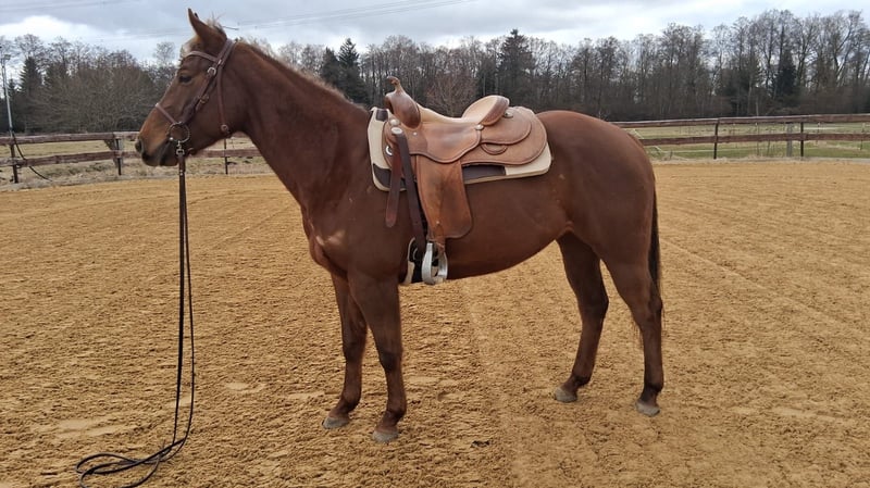 Joy Tee Rey ist eine bildhübsche Quarter Horse Stute, geboren am 21.03.2021, mit einem Stockmaß von ca. 153 cm. Sie ist korrekt gebaut, ausbalanciert bemuskelt und gesund, mit acht Röntgenbildern aus 2024. Resi ist 6-Panel n/n getestet und regelmäßig geimpft sowie entwurmt. Die Stute lebt im Offenstall in einer gemischten Herde, kennt aber auch Box mit Paddock. Charakterlich ist sie sensibel, menschenbezogen und neugierig, dabei eher ruhig und etwas faul. Sie möchte regelmäßig gearbeitet werden, braucht aber die richtige Dosis Druck bei der Arbeit, da sie bei zu viel Druck spannig wird. Nicht für Anfänger geeignet - ideal für erfahrene Reiter mit Jungpferdeerfahrung. Resi verfügt über eine solide Westerngrundausbildung, befindet sich jetzt in Vollberitt. Sie kennt Gelände, war als Handpferd und im Schritt unterm Sattel mit im Gelände. Die Stute wurde viel vom Boden aus gearbeitet. Dank ihrer sehr guten Cutting-Abstammung ist sie bestens für Cutting und Ranch-Klassen geeignet. Ihr Vater ist der erfolgreich geshowte Titanium Toy, ein Metallic Cat Sohn. Mütterlicherseits ist sie eine Dual Rey Enkelin. Mit AQHA-Papieren. Joy Tee Rey ist das perfekte Pferd für jemanden, der ein junges, herausforderndes Pferd fördern und weiterentwickeln möchte.