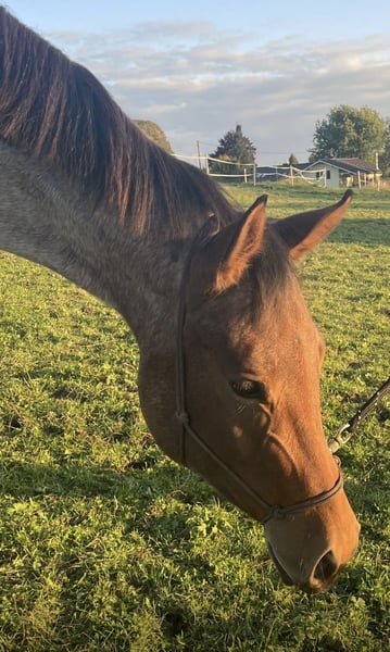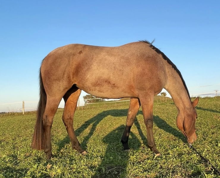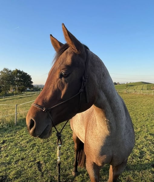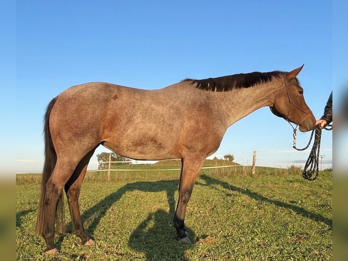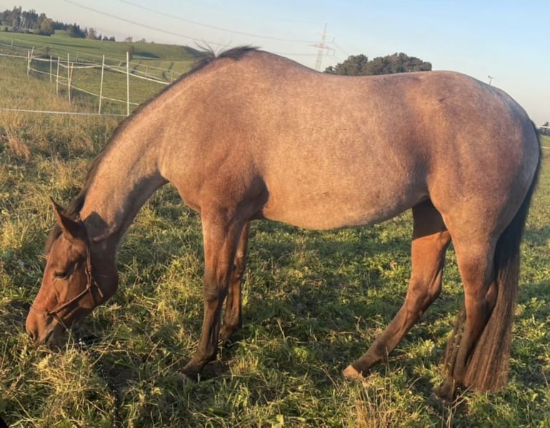 Beautiful Quarter Horse mare for sale due to lack of time: Diesel Only x Gunners Last Oak Ida is a 5-year-old beauty in a bay roan color, standing approximately 15.4 hh, born in May 2021 at my stable. She has an elegant and attractive head, a well-proportioned appearance, and a very friendly and approachable demeanor. She was gently backed in 2025 and has completed six months of basic training with a professional. She is highly trainable and eager to work, needing to be exercised about five times a week. She loves trail obstacles. Ida lives in a small herd of three mares in an open stable and is the lowest in the herd hierarchy. Her only drawback is a fear of cows, so she is not suitable for riding in areas with free-ranging cattle. She behaves perfectly in the indoor arena. I am looking for a calm and experienced person who can provide her with security, ideally in a pasture-based environment with a small herd or box stall housing with daily turnout and access to an indoor riding arena, to satisfy her need for activity. With further training, I can very well imagine her competing in all-round classes, and she would also be of interest for breeding. Due to her age, she is not suitable for beginner riders. Location: Allgäu Further information gladly by phone: 0162 / 822 34 72