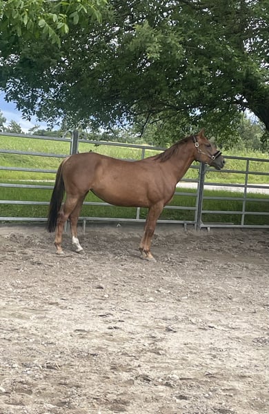 We are selling our wonderful Quarter Horse/Selle Français cross mare, born in 2020, with a heavy heart. She is a spirited yet confident horse with great talent across various disciplines. Under saddle, she is sensitive and refined, which is why she requires a rider who works with feel and without pressure. When ridden correctly, she is a reliable partner with significant potential. In the field, she is completely straightforward both alone and in a group, happily leading the way and showing no fear whatsoever. She has a solid basic training, including dressage work, lunging, small jumps, working equitation from the ground, and extensive ground work. Currently, she is in training and being further developed in the Western riding style, as we believe this discipline suits her very well. With a height of 16.1 hands, she is a compact build with a strong frame, sturdy joints, and can comfortably carry larger riders. Her price is in the higher range of the listed category. She will only be placed in the best hands. Further information available upon request.