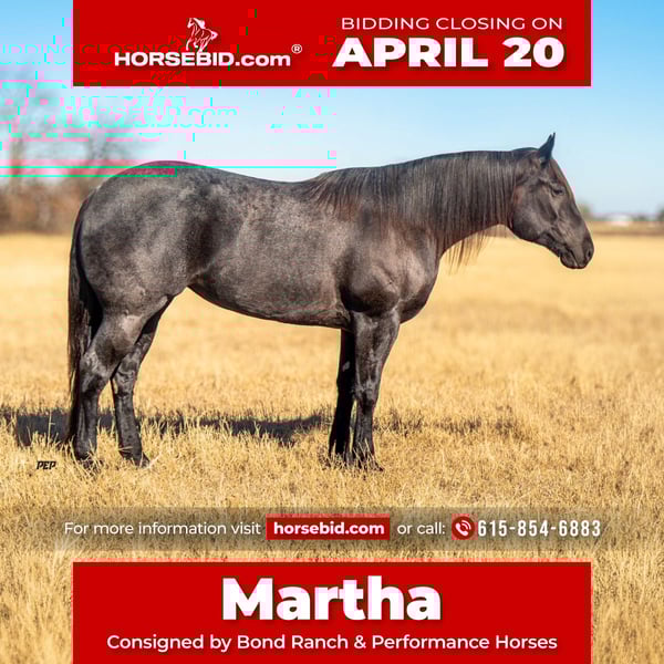 ⚜️𝐭𝐡𝐞 𝓔𝓵𝓲𝓽𝓮 𝐒𝐩𝐫𝐢𝐧𝐠 𝐂𝐥𝐚𝐬𝐬𝐢𝐜⚜️ Happening now thru MONDAY | APRIL 20th - Available EXCLUSIVELY on HorseBid's website! For more details and to register visit: www.Horsebid.com CONSIGNOR CONTACT: Bond Ranch & Performance Horses 615-854-6883 LOCATION: Ranger, TX BREED: QH REGISTERED: Yes REGISTERED NAME: Jakes Tiger Bar COLOR: Blue Roan HEIGHT: 15.3 AGE: 5 GENDER: Mare There are horses that feel ordinary — and then there are horses like Martha. A striking, 15.3 hh blue roan mare that carries herself with purpose. A true standout in any setting - Martha constantly has everybody’s attention. She is a money-earner in the NRCHA Limited Open Hackamore and has also been shown in both the NRCHA and RHAA, where she has proven herself to be consistent and honest. In the arena, Martha is every bit as refined and elegant as she looks. She carries a naturally low, attractive headset and stays soft, round, and connected through her body, making her a pleasure to ride for all levels of riders. She is responsive without being reactive, willingly tuning in to her rider and staying quiet and composed whether she is loping easy circles or stepping up to higher-level maneuvers. Her lope is slow, cadenced, and exceptionally comfortable, with a smooth rhythm that makes her feel effortless to sit. She has a deep, correct stop, beautiful transitions, and performs flying lead changes with balance and finesse — the kind of mare that feels both fancy and user-friendly every time you step on her! Martha is just as enjoyable outside as she is in the arena — the kind that makes ranch work and trail miles genuinely fun. She has years of experience gathering, sorting, doctoring cattle outside and dragging calves to the fire. Martha has been lightly started in the heading and is quiet and settled in the box, showing natural rate and feel. Out on the trail she is relaxed and confident, rides well around dogs and cattle, and stays steady and level-headed no matter what the day brings. Whether she continues in the show pen, steps into versatility and ranch events, or becomes a premium personal saddle horse, she has the foundation, consistency, and class to excel wherever she is asked. Elegant, talented, and genuinely enjoyable to be around — Martha is the kind of mare that elevates any program. We invite you to come see for yourself what makes her so truly special! Martha has a health exam and full set of clean x-rays on file and is UTD on vaccines, deworming, dental and farrier work. For any questions, please call or text Morgan at 615-854-6883.