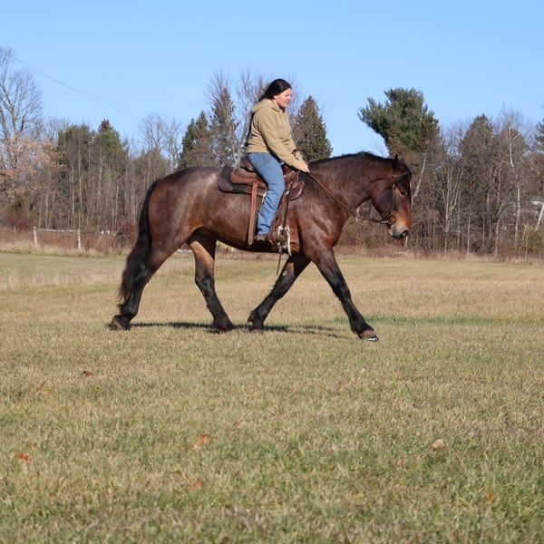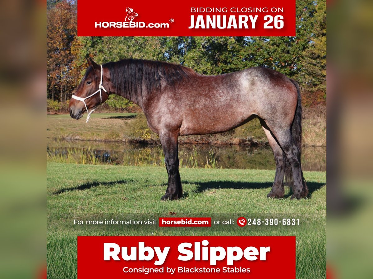 𝐉𝐀𝐍𝐔𝐀𝐑𝐘 ⭐️𝑨𝒍𝒍 𝑺𝒕𝒂𝒓 𝑳𝒊𝒏𝒆𝒖𝒑⭐️ Happening now thru MONDAY | JANUARY 26th - Available EXCLUSIVELY on HorseBid's website! For more details and to register visit: www.Horsebid.com CONSIGNOR CONTACT: Blackstone Stables 248-390-6831 LOCATION: Howell, MI BREED: Brabant Quarter Horse Cross REGISTERED: No REGISTERED NAME: Ruby Slipper COLOR: Bay Roan HEIGHT: 16.1hh AGE: 5 GENDER: Mare Ruby Slipper or Ruby as we call her around here is a 16.1hh bay roan Brabant Quarter Horse Cross. She is a solid made but yet very athletic girl. Ruby is 5 years old. Ruby is very well broke to walk, trot and canter. She is a total kitten in the barn and out in the pasture. She's playful and inquisitive while being calm and loving. Ruby is not the mareish type. She goes out in a group and plays well with all others while being easy to catch any day anywhere! Ruby has delightfully comfortable and balanced gaits. She has a quiet walk, a floaty trot and a canter you will melt right into, she takes both leads and her breaks are good! She comes equipped with all the flat work buttons you could want. She has also been started over fences and is doing amazing. Ruby has been through our whole desensitization program and passed every challenge with flying colors. She will walk-through pool noodles over bridges tarps. She will pull a sled and carry a flag. Out on the trails she will remain as levelheaded as they come take her for a gallop through a big open field or a walk in the woods. She's happy to do whatever you ask. She has been exposed to water wildlife and traffic all with no issues. She is also broke to drive. This is an all-around girl that will excel in anything from working equitation, to a trail horse or as a hunt horse, cross country mount or that all around horse the whole family can enjoy. You can take her out and have a blast but yet trust her when beginners come over to go for a ride! She's available for a private sale now!