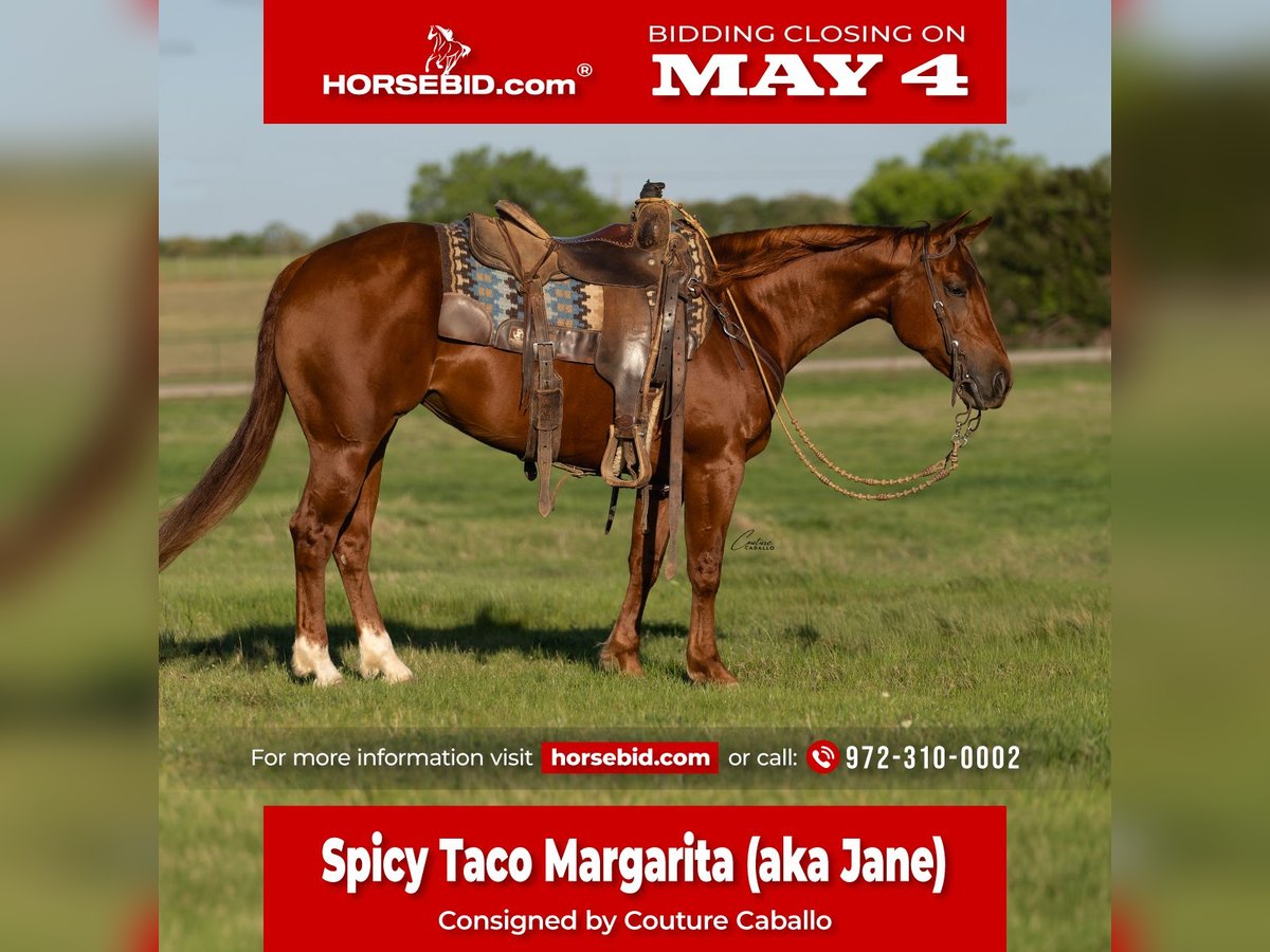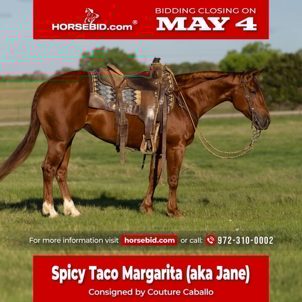 ▪️▫️◾️𝐭𝐡𝐞 𝑴𝒂𝒚 𝐒𝐞𝐥𝐞𝐜𝐭◾️▫️▪️ Happening now thru MONDAY | MAY 4th - Available EXCLUSIVELY on HorseBid's website! For more details and to register visit: www.Horsebid.com CONSIGNOR CONTACT: Couture Caballo 972-310-0002 LOCATION: Fort Worth, TX BREED: AQHA REGISTERED: Yes REGISTERED NAME: Spicy Taco Margarita COLOR: Sorrel HEIGHT: 14.2 AGE: 5 GENDER: Mare There’s an old saying my grandparents would always tell me, and it rings clear as can be with this mare: “Purdy is as Purdy does.” On the exterior, you’re looking at a plain Jane. One you might scroll past. One easily overlooked at first glance. But after spending but a moment with this gal, Jane proves exactly why you don’t need to be shiny or chrome to be beautiful. That a true beauty stems from whats under the hood. Jane might not scream for attention, but this little sorrel mare earns your admiration through who she is on a daily basis. Spicy Taco Margarita, affectionately known as “Plain Jane,” has been in a professional cutting program her entire life and shows up exactly how you’d hope every single day—seasoned, experienced, consistent, and ready to go to work. By the million dollar sire, Sigala Rey (6 Panel N/N) and out of a half sibling to the NCHA earner of over $220k, Taco Buena (LTE $17K+ | Producer $28K+), making her as valuable on paper as she is in the saddle. A finished cutter with a true user friendly feel, Jane rides around on a draped rein, neck reins with ease, and carries herself with that smooth, confident cadence that makes her a pleasure both in and out of the arena. She’s athletic, very cowy, quick footed with a huge stop to match. This mare is built to perform and is as broke as a 50 cent taco. Whether you’re hitting the weekend cuttings, chasing a versatility title, or poking around out on the ranch, Jane brings the perfect balance of spice and amicability to daily life! She cuts, sorts, works a gate, has a short jog, a long, ground-covering extended trot, and a steady, dependable mindset. Underneath it all, she’s solid and clean made with a foundation you can trust. No shortcuts, no holes, just a well rounded gal that’s ready to add so much to her next riders life! Eligible for: Breeders Invitational, NCHA Super Stakes, NRCHA Stallion Stakes, Southern Cutting Futurity Stallion Incentive, Legendary Stakes