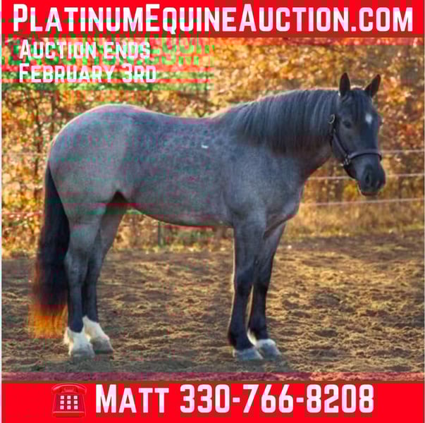 ONLINE AUCTION Place your bids at www.PlatinumEquineAuction.com Starting Bid $3500 Auction ends February 3rd, 2025 Need a new saddle? Check out White Rock Saddles on our website or Facebook! Wow take a look at Pearl, 4 year old, true blue roan Percheron x Quarter horse crossbred mare. She stands 15.3 hands tall and is very well broke to ride and lightly started driving. She’s been on our farm for just over a year and a half and has been a pleasure to have around, she’s been quiet minded and easy going mare with a puppy dog personality from day one. Pearl is the perfect trail partner and has been a go to horse for beginners this past summer. She crosses creeks, logs, and any trail obstacle that crosses her path. Pearl is content to ride out alone or in a group. You’ll never know that she’s a mare because she acts much more like a gelding and is content to be at the bottom of the pecking order. She neck reins, moves off leg pressure, and will ride around bridless. She’s built right and has good feet. Pearl stands great to groom, tack, clip and bath. She’s great for the farrier, loads with ease, and easily adapts to new environments. She is 100% Traffic safe and sound and has no vices. For more information, pictures, or videos contact Big Rock Stables Matt 330-766-8208 We encourage you to come try her out! ONLINE AUCTION Place your bids at www.PlatinumEquineAuction.com Starting Bid $3500 Auction ends February 3rd, 2025 Need a new saddle? Check out White Rock Saddles on our website or Facebook!