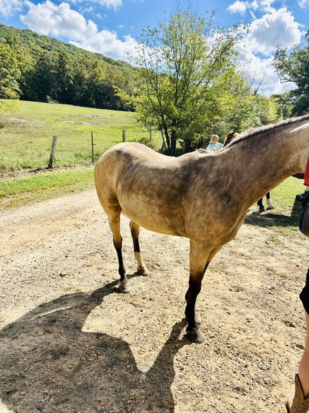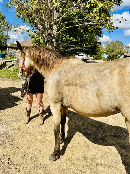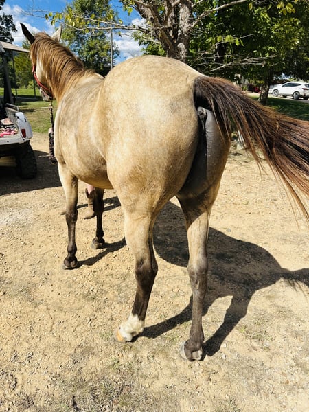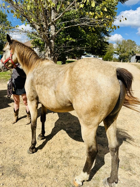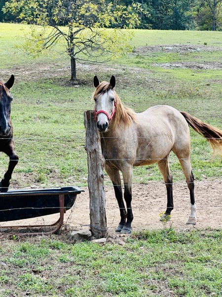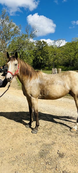 Beautiful Buckskin Mare. She is six years old and 14.2 hands approximately. She has been ridden a few times and is green broke only started. She has been shod.