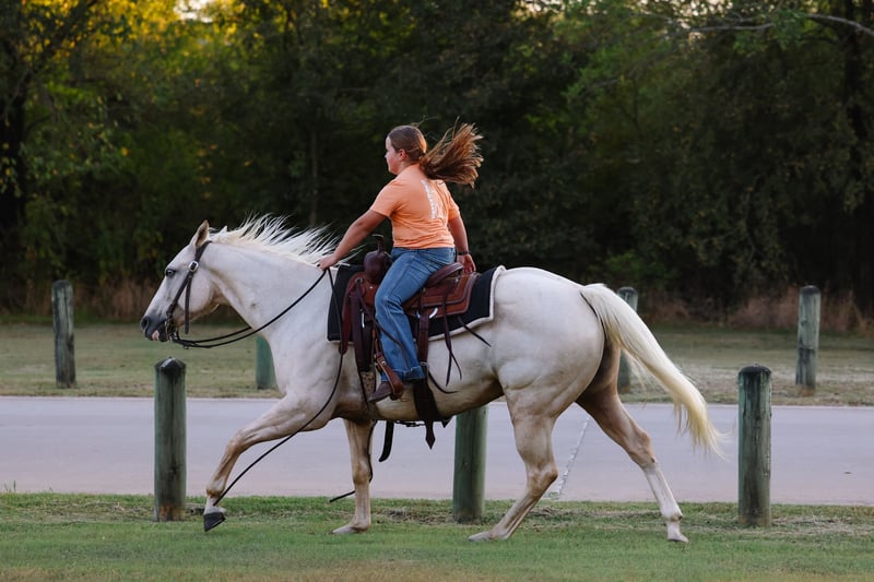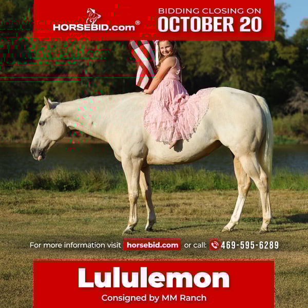 ♦️ 𝐭𝐡𝐞 𝐀𝐌𝐄𝐑𝐈𝐂𝐀𝐍 𝓕𝓪𝓵𝓵 𝓒𝓵𝓪𝓼𝓼𝓲𝓬 ♦️ Happening now thru MONDAY | OCTOBER 20th - Available EXCLUSIVELY on HorseBid's website! For more details and to register visit: www.Horsebid.com CONSIGNOR CONTACT: MM Ranch 469-595-6289 LOCATION: Forney, TX BREED: Quarter Horse REGISTERED: No COLOR: Palomino HEIGHT: 14.2 AGE: 5 GENDER: Mare 🍋Unicorn Alert!!🍋 This is Lululemon. The most unique little mare. She is light palomino with one crystal blue eye. She is an absolutely GLAMOROUS mare standing at the perfect size of 14.2 hands tall. A one in a lifetime find and at just 5 yrs old she has her whole life in front of her. She was born and raised on the same place. Imprinted and handled since birth. She has the most loving and kind disposition. She is naturally gentle and kind. Doesn’t have a mean bone in her body. Absolutely loves attention from any and everyone. Especially kids!!! Not even an ounce of spookiness. No snorting or watchiness. Absolutely no bad habits. She is the ultimate sweetheart. Lululemon has a solid foundation in her training. 🍋🌟 As a 3 yr old she had 6 months of professional reining and working cow horse training. She has all the ability and cow sense. So talented and smart. And so easy to ride. 🍋✨This girl could stand in place in lope. She is so refined and elegant. Her trot and lope is Effortless for her!! So smooth and easy. You barely have to squeeze to get her to step off in it. She is Fancy!!! She has all the bells and whistles as they say!!! She is ready to go on and do big things. She has been rode both in and out of the arena. Rode out on the ranch and checked cattle and been on lots of trail rides. Even had some roping done on her. You do not have to be a cowboy to ride her. 💥The best thing about her is she is absolutely safe and gentle. I have never seen this mare do anything wrong. No bad habits. Absolutely no quirks or vices about her. 🍋 She perfect to be mounted. Stands perfect for baths. She will meet you at the gate every time. And comes right up to you and puts her head in the halter. She loves going to work. She wants to please and wants to learn. Absolutely NO warming her up. Just jump on her and go. She is safe for anyone to ride!!! She really has the capability to do anything you want to do on her. You will get noticed riding her. She is pretty. 🌎 We can and will help arrange affordable shipping if needed. She is up to date on all shots and worming. She just had her feet done. She is ready to go to her new home. Call with anymore questions you may have about her.