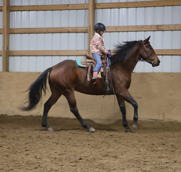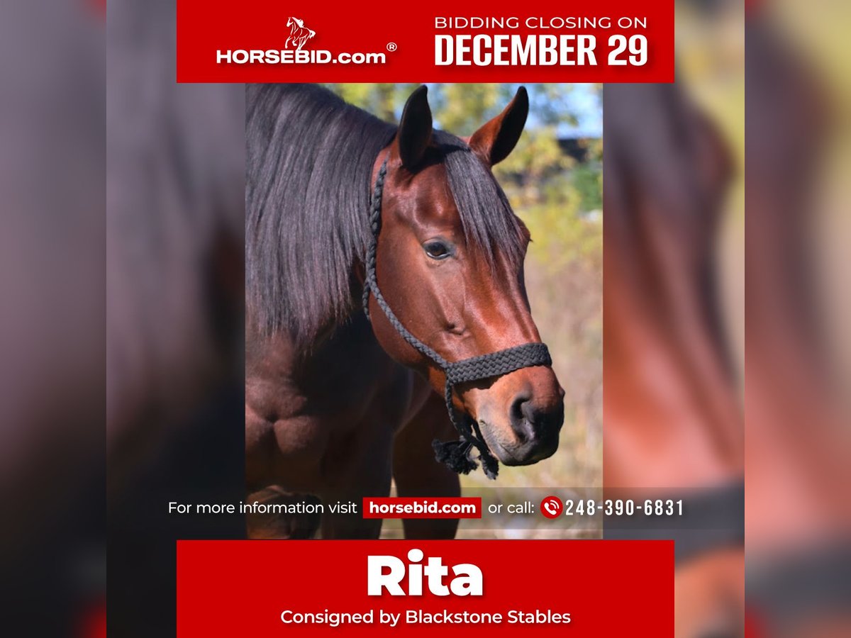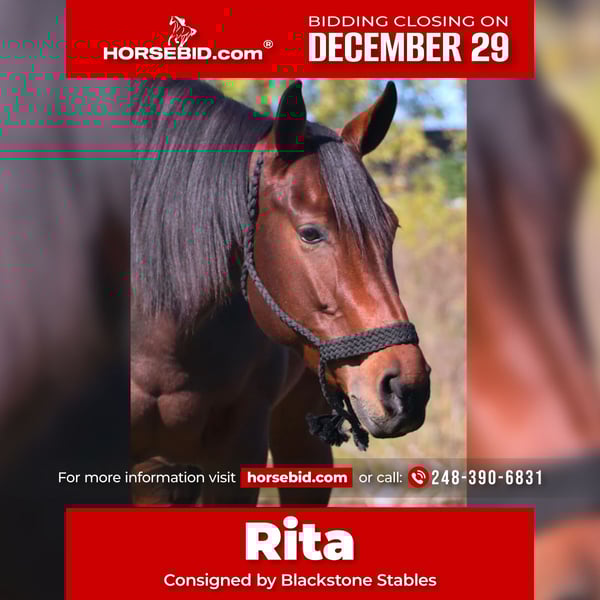 ⚜️𝐓𝐇𝐄 𝓗𝓮𝓻𝓲𝓽𝓪𝓰𝓮 𝐖𝐢𝐧𝐭𝐞𝐫 𝓒𝓵𝓪𝓼𝓼𝓲𝓬⚜️ Happening now thru MONDAY | DECEMBER 29th - Available EXCLUSIVELY on HorseBid's website! For more details and to register visit: www.Horsebid.com CONSIGNOR CONTACT: Blackstone Stables 248-390-6831 LOCATION: Howell, MI BREED: Quarter Horse REGISTERED: Yes REGISTERED NAME: R Rita’s Royal Asset COLOR: Bay HEIGHT: 15.2 AGE: 5 GENDER: Mare R Rita's Royal Asset is a 2020 AQHA Bay Mare. She is safe, and reliable. Rita is a stunning bright bay who stands 15.2hh! She’s the ultimate all-around partner — safe, steady, and experienced both in the arena on the trails and out working the cows! She's the type of mare that can roll her sleeves up and do a full days work on the ranch but also get a bath and venture into the show ring the next day. She has stunning conformation and her bloodlines go back to These Irons are Hot, who is leading sire in the hunt seat industry, known for passing on his winning traits, size, movement, and disposition to his offspring. Rita is extremely willing and eager for a job. She takes to everything with ease and is an all around natural. Rita is safe, dependable, and a smooth ride. She is 100% youth safe. Kids as young as 7 have ridden her in play day events. She has every button one could ask for while being calm enough to teach a kiddo or nervous adult. We have started some western dressage with her. She's got light and elegant moment, balanced gaits, knows her leads, has her flying changes and her breaks are good. She also comes equipped with excellent power steering. Shes been exposed to many miles in the woods, around the cows and every obstacle you can think of. She has also climbed the sleeping bear sand dunes and has galloped the shoreline of Lake Michigan! She's not one to spook. Rita has also been ridden English and this girl can jump! She's the point and shoot type who's very adjustable to the jumps. She also has automatic flying changes. The sky's the limit on what she can do. From being a trusty trail partner to, working EQ, western dressage, hunters, or moving cattle she's the one. The whole family can enjoy her as she will adapt to her rider. Her manners are A+, she's not mareish and gets along with all others outside.