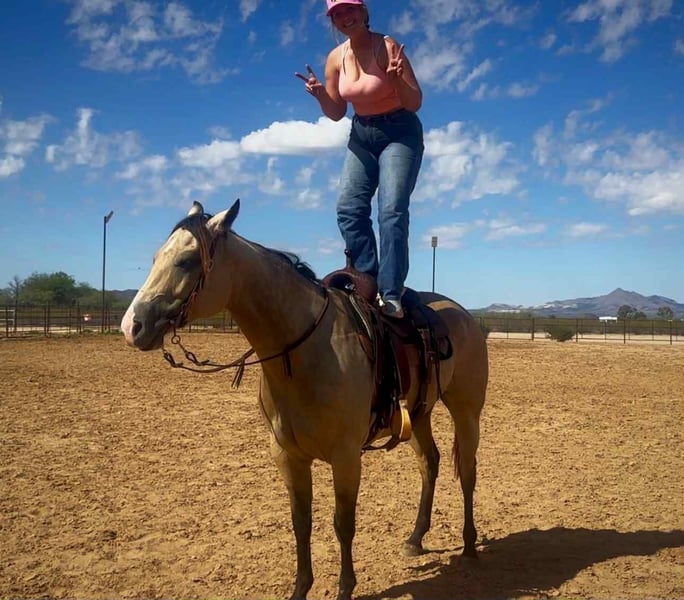 ONLINE AUCTION Place your bids at www.PlatinumEquineAuction.com Starting Bid $3500 Auction ends November 9th, 2025 Need a new saddle? Check out White Rock Saddles on our website or Facebook Miss Josies Song… Who doesn’t love a big beautiful dappled buckskin! Josie is a 5 year old AQHA mare who stands 15.3 hands tall. She is a big gentle giant and absolutely loves her people. Josie started out as a ranch horse and has done every job on the ranch from roping to sorting to gathering cattle. She keeps a level head in all situations and enjoys working and having a job. For the last year Josie has mainly been a go-to pleasure and trail horse. She will cross and go through anything you ask her to, has a nice ground covering walk, and travels out on a loose rein alone or with others. Josie has been ridden by all levels of riders and adjusts well to who is on her back. She has never offered to buck and stays gentle even with time off. She has also carried the flag and it doesn’t phase her at all! We have done the trail course obstacles with her as well and she is brave and willing to try whatever is asked of her. She would also make a wonderful barrel horse or head horse prospect. Josie has wonderful ground manners and an in your pocket personality. She stands tied, bathes, loads and hauls nicely. She is currently barefoot and has no issues and requires no maintenance. Josie is ready to find her person to adventure with! She is located in Marana, Arizona and we would be happy to help arrange transport anywhere. She will come with a current coggins and health certificate. Please feel free to call or text Claire Siebols with any questions at 435-899-0508. ONLINE AUCTION Place your bids at www.PlatinumEquineAuction.com Starting Bid $3500 Auction ends November 9th, 2025 Need a new saddle? Check out White Rock Saddles on our website or Facebook
