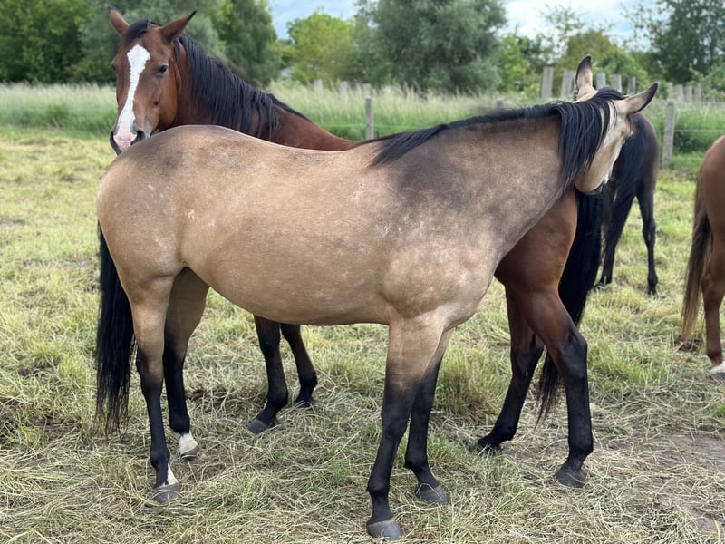 Verkaufe eine wunderschöne American Quarter Horse Stute, geborene 2019, in der eleganten Farbe Buckskin. Mit einem Stockmaß von 130 cm ist sie perfekt für den Freizeitbereich geeignet und überzeugt durch ihre freundliche und ausgeglichene Art. Diese Quarter Horse Stute ist ideal für kleine Reiter, die ein zuverlässiges und vielseitiges Pferd suchen, das sowohl im Gelände als auch in der Freizeitreiterei begeistert. Sie ist noch nicht geritten, aber gelassen im Umgang und zeigt ein ausgeprägtes Temperament, das sie zu einem treuen Begleiter macht wird. Ein echtes Schmuckstück für jeden Freizeitreiter, der Wert auf Charakter und Vielseitigkeit legt.