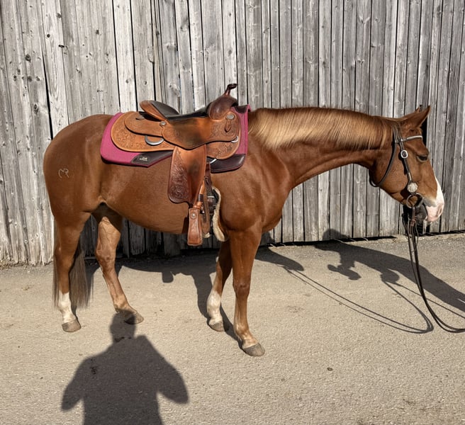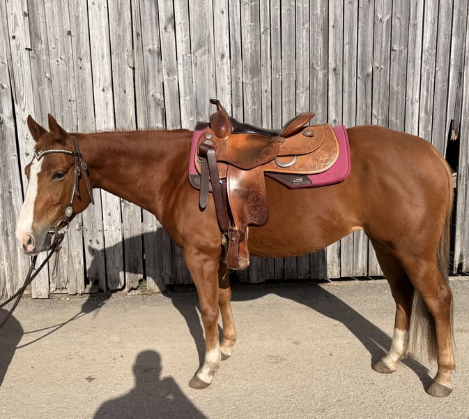 Mare Born in 2019 16.1 hh (1.48 m) Barefoot (has previously had slider) Farrier and loading confident "Kiri" moves confidently in her basic gaits both indoors, on the arena, and in the terrain. She has been in professional training and is familiar with reining maneuvers. She shows talent for ranch classes and is currently being further trained in this discipline. In handling, she is very straightforward and well-behaved. She needs to be challenged and motivated and is therefore not suitable for beginners. Kiri is accustomed to stall/paddock box with daily turnout and open stable management in a mixed herd. (Preference given to sale in open stable management) She has previously had a foal. She has been regularly wormed and introduced to the farrier. Her teeth were checked in January 2026. A veterinary health certificate (AKU) can of course be obtained on-site by the buyer. X-ray images from March 2025 are available. Kiri is not sold to inexperienced beginners, dealers, or riding schools. Due to a minor health issue, she is offered at a significantly reduced price. To prevent riding tourism, we charge €25, which will be credited upon purchase.