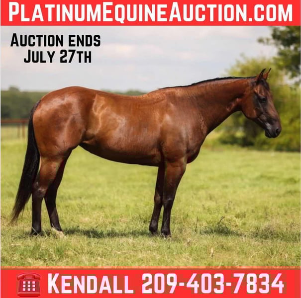 ONLINE AUCTION Place your bids at www.PlatinumEquineAuction.com Starting Bid $3500 Auction ends July 27th 2025 Need a new saddle? Check out White Rock Saddles on our website or Facebook Stella is a stout built, 6 year old mare. She stands 14’3 hands, she’s been used around the ranch in all aspect of ranch work. She has carried flags, she is great on the trails and walks through water, over logs, and handles slopes. Stella is very gentle and easy to catch. She stands to saddle, pick her feet, and brush. She is very easy to get along with and has a great demeanor. Any questions call Kendall Anderson 209-403-7834 Located in Canton, TX. ONLINE AUCTION Place your bids at www.PlatinumEquineAuction.com Starting Bid $3500 Auction ends July 27th 2025 Need a new saddle? Check out White Rock Saddles on our website or Facebook
