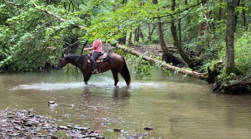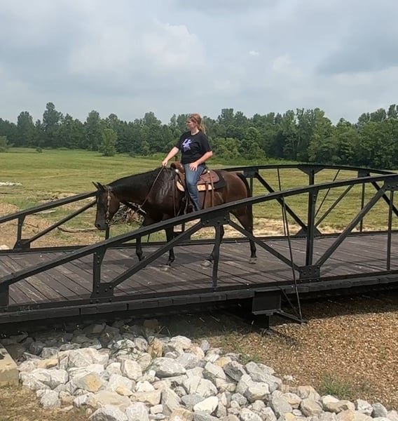 "AVAILABLE ON ONLINE HORSE AUCTION AT www DOT MagicHorseAuction DOT com BIDDING OPEN NOW thru TUESDAY | JULY 22nd - BUY IT NOW AVAILABLE! *Final price will be determined on auction site* CONSIGNOR CONTACT INFO: Tasha Ijames 270-844-2400 LOCATION: Henderson, KY Daisy is a gorgeous 7yr old dark bay mare standing about 15 hands tall and weighs around 1050lbs. She’s one hand broke and one that you can ride around with just a grass string. Daisy’s still young and has a lifetime ahead of her to spend and grow with a family. Daisy is a great trail horse. She is one that doesn’t care if she’s in the front, middle, or back of the pack. Daisy will cross all types of water, cross logs, go through mud, rough terrain, over bridges and is traffic safe. She’s not spooky out on the trail and will walk all day if asked. Not only is she great out on the trail, but Daisy has also been to team sorting and played with the cows. Daisy will walk, trot, and canter when asked and takes both leads. Daisy will ride out alone and away from the barn and be dependable. Daisy makes mounting simple as she will stand at a mounting block or anything you can find out on the trail for you to get on and will stand until asked to move. Daisy is currently shod all the way around. She stands great for the farrier, baths, tacking/untacking, and mounting. She’s easy to catch. She does great in a stall as well and has great stall manners. She loads in and out of the trailer easily. If you are looking for a lifetime partner to add to your family look no further. Daisy is a solid horse to go ride on the trails, in the arena or on the ranch. She has a very sweet demeanor and loving attitude. She loves to be groomed and absolutely enjoys the attention. We invite anyone and everyone to come meet and ride Daisy at our barn in Henderson, Kentucky. We are happy to assist with transportation arrangements. For any questions about Daisy please contact Tasha 270-844-2400