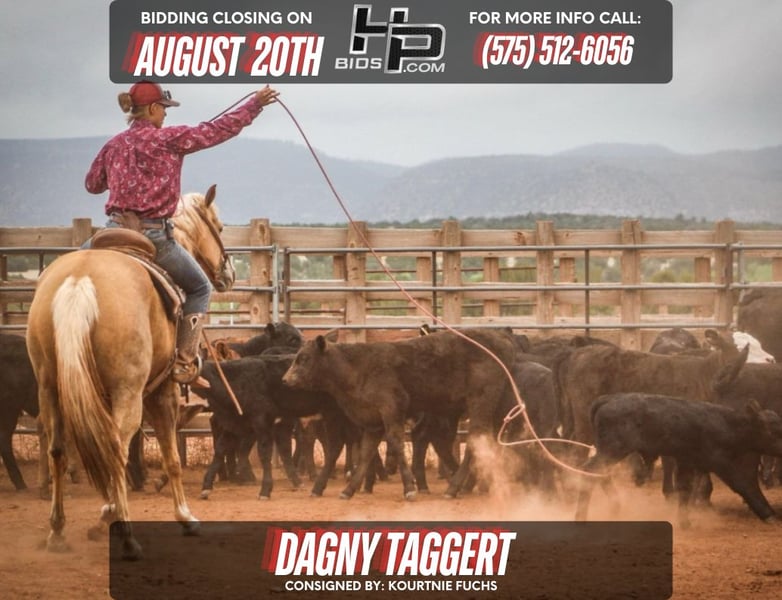 🔥 Happening NOW thru August 20th - Available EXCLUSIVELY on HP Bid’s website! For more details and to register visit: https://hpbids.com CONSIGNOR CONTACT: Kourtnie Fuchs - (575) 512-6056 LOCATION: Santa Rosa, NM BREED: AQHA REGISTERED: Yes COLOR: Palomino HEIGHT: 15.3 AGE: 7 GENDER: Mare Dagny is a 7 yr old mare. She has worked on a ranch since she was started at 2 yrs old, she has also worked at feed yards and sale barns. She has roped outside, has been very lightly been heeled off of, she works off her back end very well and has a decent stop. I think she would make a good breakaway prospect but has not been tried. She is very nicely papered, top side is western pleasure breeding, she goes back to the legend of western pleasure Radical Rodder, on the bottom side she has great cutting/reining bloodlines.