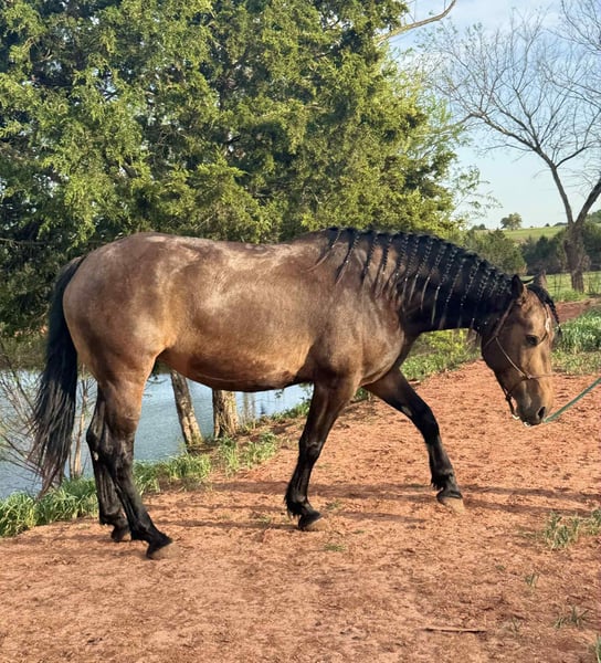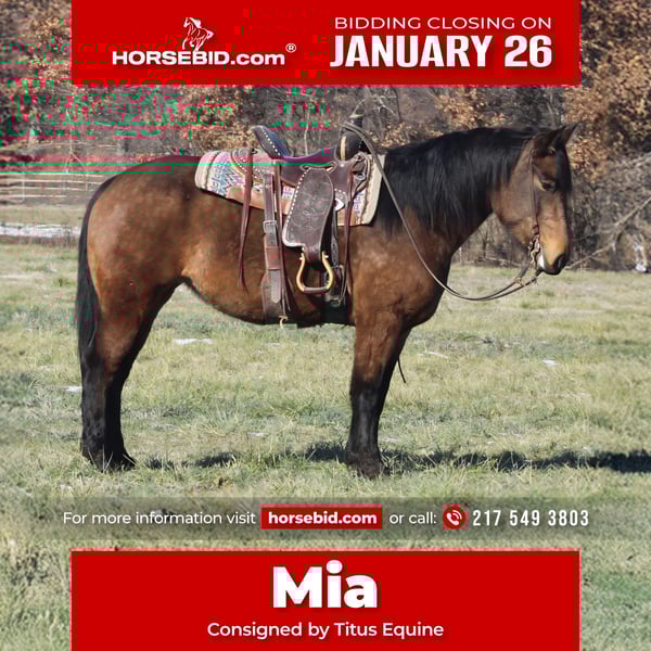 𝐉𝐀𝐍𝐔𝐀𝐑𝐘 ⭐️𝑨𝒍𝒍 𝑺𝒕𝒂𝒓 𝑳𝒊𝒏𝒆𝒖𝒑⭐️ Happening now thru MONDAY | JANUARY 26th - Available EXCLUSIVELY on HorseBid's website! For more details and to register visit: www.Horsebid.com CONSIGNOR CONTACT: Titus Equine 217 549 3803 LOCATION: Charleston, IL BREED: Qh Percheron Cross REGISTERED: No REGISTERED NAME: Mia COLOR: Buckskin HEIGHT: 15.2 AGE: 7 GENDER: Mare Mia is a 15.2 hand, 7 year old buckskin quarter horse Percheron cross mare that the whole family can enjoy. She is safe, sane, and honest, the kind you can trust day in and day out without any surprises. She has been used on the ranch, trail ridden, and taken to town, and she handles it all with a calm, steady mind. This mare is gentle enough for less experienced riders but has enough size, strength, and sense to be enjoyed by adults as well. She is sound in every way and stays level headed whether she is working, riding out, or just being handled around the barn. Mia is easy to get along with, easy to ride, and has the kind of disposition families look for when they want one horse everyone can use. If you are looking for a dependable, family-safe mare that is broke right and has been there and done that, Mia is one you can feel good about putting your kids, spouse, or friends on.