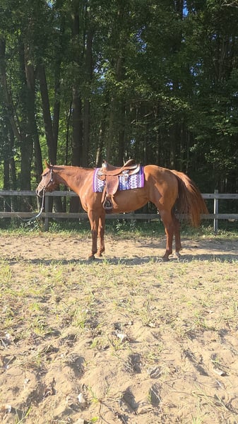 "AVAILABLE ON ONLINE HORSE AUCTION AT www DOT MagicHorseAuction DOT com BIDDING OPEN NOW thru TUESDAY | October 14TH! - BUY IT NOW AVAILABLE! *Final price will be determined on auction site* CONSIGNOR CONTACT INFO: Sarah Collins 419-822-7526 LOCATION: Walbridge, OH First things first Sage CAN be registered AQHA. Her sire is Kissin the Girls, who needs no introduction, and her dam is Only Invite the Hot. I have raised this one of a kind mare since she was 4 months old. Life simply got in the way of me continually procrastinating registering her. Sage is 16.2 hands and built like an absolute house. No pictures can do this true all around mare her full justice! Sage began her show career as a yearling in Showmanship and Halter. Sage was shown in ranch, western and English pleasure, horsemanship, equitation and trail until she was a 4 year old. Sage does patterns excellent as well. Sage was never pushed or overworked. She was raised the right way and broke to ride slow and correct. Her jog/long trot is finished for pleasure shows. Her lope needs a tune up for Western pleasure but is ranch or English ready. You can show this mare all day with very little prep. Her stamina never wears out! She LOVES the show pen and knows her job well! She rides one handed and is spur trained. Extremely responsive to leg while doing a 360 or sidepass. Sage truly does everything! Sage is very accustomed to the show life and hauled all over showing in all the events. On the trails she crosses whatever is in her path including logs, bridges, mud and water. She will follow, go in the middle or lead all while riding on a loose rein. Sage carefully places her feet while taking care of her rider. Sage is a true DIY horse and can sit for months at a time and will ride exactly the same way, every time. She remembers her training and stays broke! She is traffic safe, accustomed to tractors, motorcycles, bikes and four wheelers. Her entire life she has received the best care, regular vaccines, wormer and hoof care. Shes never worn or needed a shoe, even on rocky terrain. Never taken a lame step. Regularly maintained with chiropractor and massages. Never injected or any other maintenance. Sage is in a mixed herd with 24/7 turnout on grass hay. Very easy keeper on 6 pounds grain daily. Sage also stalls phenomenal without cribbing, pawing or kicking. Sage will meet you at the gate everytime in any size field. She clips great (twitch for ears), loads, bathes and ties. Absolutely no holes or vices in this mare! The ONLY reason this gorgeous mare is being sold is due to me suffering a back fracture in 2023. It's not fair to this mare to sit in a field or be an occasional trail horse. I can answer any and all questions about her by calling Sarah Collins 419 822 7526. Transportation can be arranged anywhere using safe, well known haulers. Don't pass up this iconic mare with her whole show career ahead of her and then can produce top quality foals.
