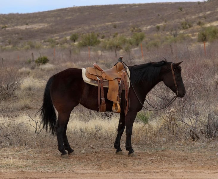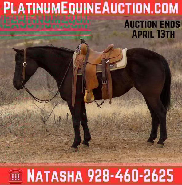 ONLINE AUCTION Place your bids at www.PlatinumEquineAuction.com Starting Bid $3500 Auction ends April 13th, 2025 Need a new saddle? Check out White Rock Saddles on our website or Facebook! Beauty is a grade 7 year old mare standing 14.2hh. This black mare is as handy and gentle as she is gorgeous!! Beauty has been used around ranches all over Arizona and New Mexico her whole life, making her very versatile, experienced, and absolutely safe and gentle!! Beauty is not only surefooted and great to ride outside, she’s also just as fancy in the arena!! Beauty has done absolutely every job a horse can do around a ranch. Rode countless miles of fence, drug calves to the fire, doctored lots of cattle alone and with a crew making her proficient at working a rope, sorted pens, worked gates, you name it and Beauty has done it!! This magnificent mare will cruise right along no matter what country she’s in or what comes up in front of her. Rough rocky terrain, steep slippery slopes, flowing water, fallen logs, thick brush, busy traffic. No matter the obstacles, Beauty will bulldoze on through it safely and surefooted as can be, watching her every step. Beauty is just as much of a blast to ride in the arena as she is to ride outside! She will walk, trot, and lope both ways with ease on a draped rein as well as neck rein and has a magnificent stop! She’ll even ride bareback and bridless!! Beauty will meet you at the gate to catch whether she’s in a 12×12 stall or a big turnout. She’s also easy to groom, saddle, bridle, bathe, shoe, and load!! Whether you’re looking for a super gentle, gritty mare to go do a long days work or a laid back, safe and gentle ride to mosey on down the trail then look no further, Beauty is your gal!! Will come with a clean coggins and health!! Transport can easily be arranged anywhere in the US!! Located in Camp Verde, AZ. Contact D/C Equine Services Dallas 804-822-2233 Natasha 928-460-2625. ONLINE AUCTION Place your bids at www.PlatinumEquineAuction.com Starting Bid $3500 Auction ends April 13th, 2025 Need a new saddle? Check out White Rock Saddles on our website or Facebook!