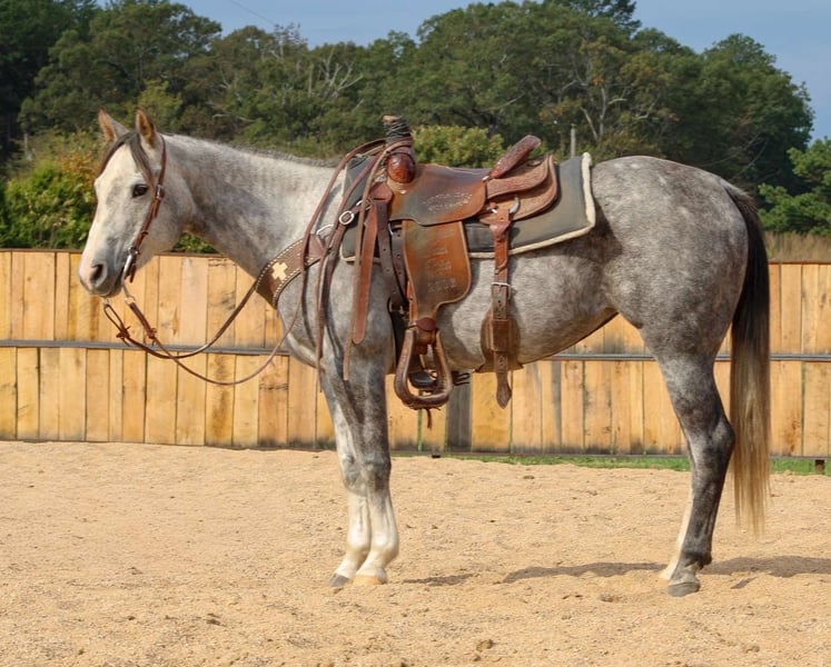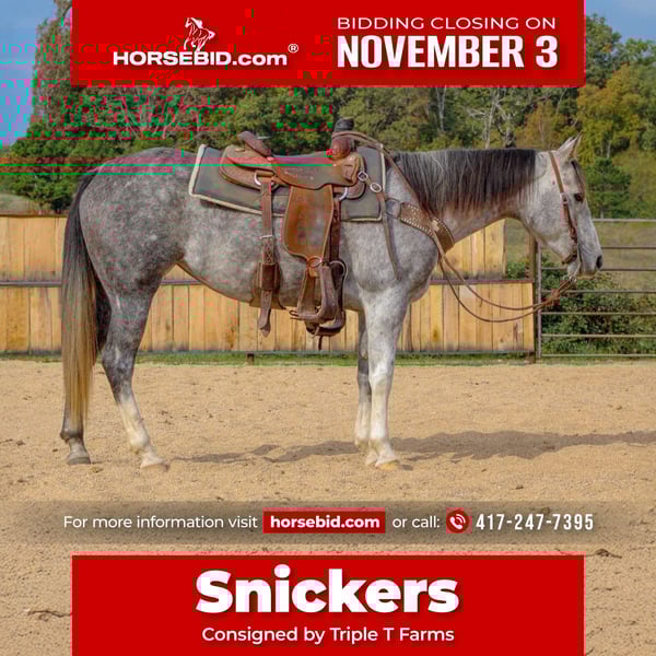 ⚜️𝐓𝐇𝐄 𝐅𝐀𝐋𝐋 𝐇𝐄𝐑𝐈𝐓𝐀𝐆𝐄 𝐂𝐋𝐀𝐒𝐒𝐈𝐂⚜️ Happening now thru MONDAY | NOVEMBER 3rd - Available EXCLUSIVELY on HorseBid's website! For more details and to register visit: www.Horsebid.com CONSIGNOR CONTACT: Triple T Farms 417-247-7395 LOCATION: Summersville, MO BREED: Quarter Horse REGISTERED: Yes REGISTERED NAME: PG Sixbee 1178 COLOR: Grey HEIGHT: 14.2 AGE: 7 GENDER: Mare Meet Snickers, our stunning 7 year old 14.2 registered grey mare! What's not to love? She’s not just beautiful; she’s got the drive and heart to take on anything you throw her way. Snickers is making fantastic progress heeling cows and breakaway roping. She’s been a star at local rodeos—always delivering great performances. She’s got a smooth neck rein and is quick to respond to cues and pressure. With her excellent ground manners, my son took her to a local horse show and brought home a nice ribbon in the halter class, while my daughter came home with the trophy in the lead line! She’s traveled far and wide across our state and beyond for rodeos and trail rides. No matter the terrain, Snickers tackles it all with confidence and poise. She stands beautifully for the farrier and adores the kids who love giving her baths and brushing her.