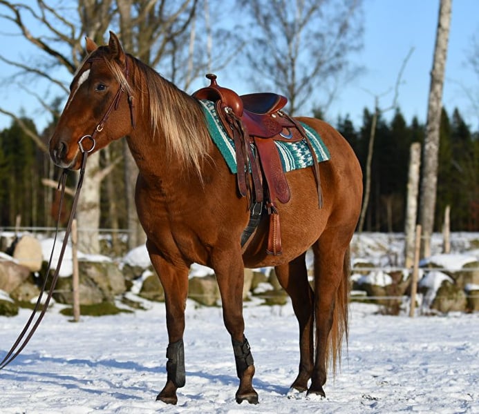 Jument de reproduction unique, à la recherche d’un nouveau bon foyer. Homozygote pour le gène de couleur le plus rare chez le quarter horse, le bay argenté, une opportunité exceptionnelle pour les éleveurs souhaitant associer couleur et qualité. E/e A/a Z/Z, totalement exempt de MCOA, ainsi que ses descendants. 7 panel n/n. Entièrement saine, facile à faire reproduire, les poulains naissent facilement, excellente mère et facile d’entretien. Facile pour le maréchal-ferrant, le vétérinaire, le chargement, sociable en troupeau, rang inférieur dans la hiérarchie. Montée, très bien dressée, calme et docile. Principalement utilisée comme jument de reproduction. Elle a été importée des États-Unis. Elle donne des poulains de reining d’un potentiel exceptionnel. Son poulain de 2025, par Einsteins Revolution, est magnifique et cherche également un nouveau foyer. Raison de la vente : trop de chevaux. Prix raisonnable en raison de cela. Elle se trouve en Suède. Contactez-moi pour plus d’informations.