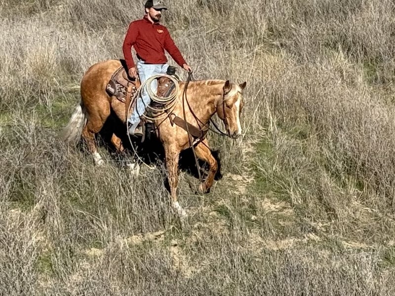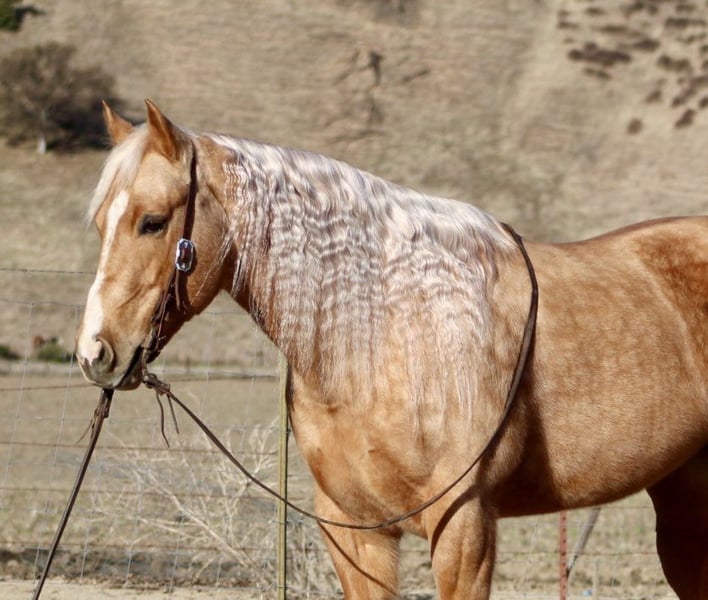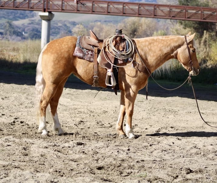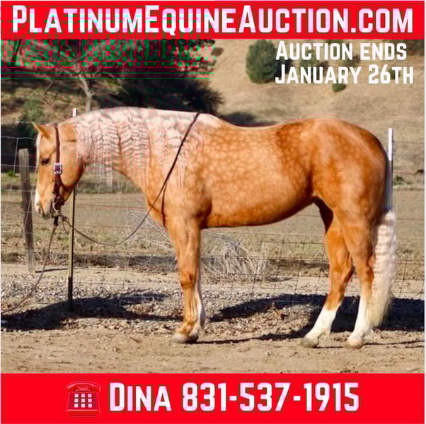ONLINE AUCTION Place your bids at www.PlatinumEquineAuction.com Starting Bid $3500 Auction ends January 26th, 2025 Need a new saddle? Check out White Rock Saddles on our website or Facebook! I am excited to introduce you to a truly remarkable horse… Autumn is a stunning golden dapple palomino mare, 7 years old and standing at 15 hands tall. Her dapples look like Autumn leaves it’s just absolutely beautiful. Autumn possesses a friendly and kind disposition, making her an easy, safe, gentle, and kind-hearted companion. Autumn is nicely broke, showcasing a beautiful headset and exceptional skills. She picks up her leads in perfect circles and transitions seamlessly into a walk and a slow trot, complemented by a nice sliding stop and smooth backup. On the trail, she is a dream; confidently navigating steep trails, flowing creeks, downed trees, thick brush, and deep mud. Autumn enjoys scenic trail rides and has experience gathering cattle across various terrains, proving her surefootedness and safety for the entire family. She is also calm around busy roads, walking past cars, semis and cyclists with ease, highlighting her adaptability in different situations. Autumn excels at trail obstacles, willingly walking over bridges, crossing tires, and maneuvering through pool noodles and covered wagons. She is not bothered by tarps,flags or bouncy balls She embraces any task you present to her. A joy to be around, Autumn behaves like a gelding and gets along well with other horses in the pasture. She also appreciates a cozy stall on cold days. Loading into any trailer is no trouble for her, and she travels well, feeling confident in new environments. Autumn ties in crossties for grooming and tacking up and is easy to catch, often greeting you at the gate with her endearing personality. She has been a delight for all of us, and I am confident she will impress her new owners with her kind and inviting nature. If you have any questions or need further information, please feel free to reach out to Dina at Longhorn Ranch at 831-537-1915. We are located in Paicines, CA. I look forward to discussing this amazing horse with you, and if you require assistance with shipping, we have several reputable haulers available to transport her nationwide.