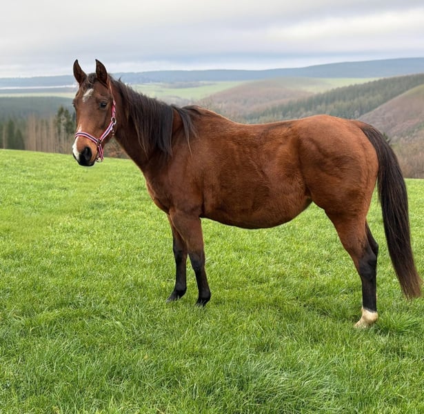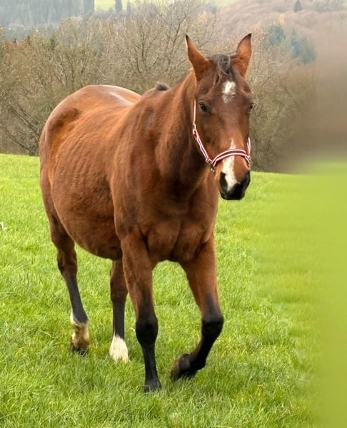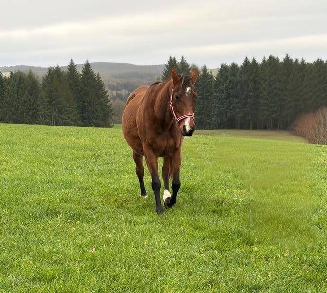 Quarter Horse Stute mit Abstammung – tragend – sucht neues Zuhause Wir suchen für unsere Quarter Horse Stute Tender Hope (Rufname Hope) ein liebevolles neues Zuhause. Sie ist 9 Jahre alt und ca. 150 cm groß. Hope ist tragend; laut Tierarzt wird das Fohlen voraussichtlich im März zur Welt kommen. Im Umgang ist sie eine äußerst liebe und sehr brave Stute. Sie ist kindergewöhnt und zeigt sich in jeder Situation ruhig und gelassen. Natürlich ist sie auch geritten und stets zuverlässig, aktuell jedoch nicht im Training. Wer eine wirklich brave, gutmütige und unkomplizierte Stute sucht, findet in Hope eine treue Begleiterin.