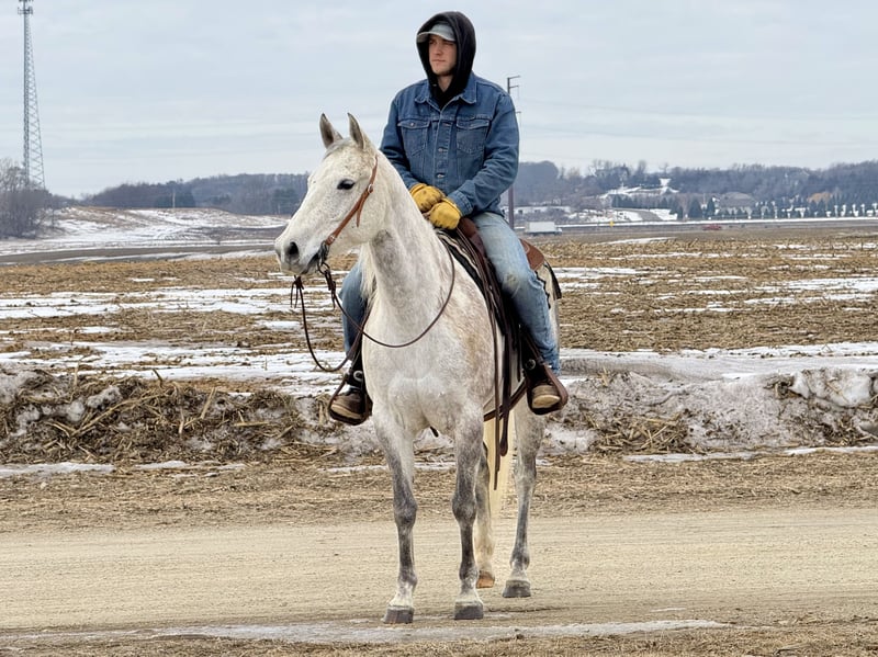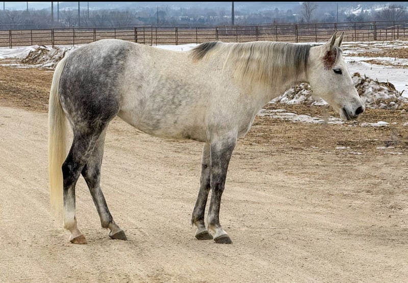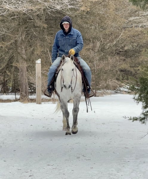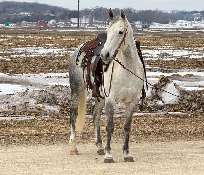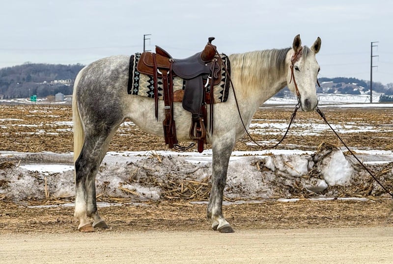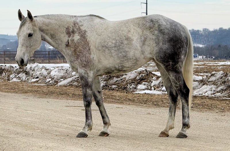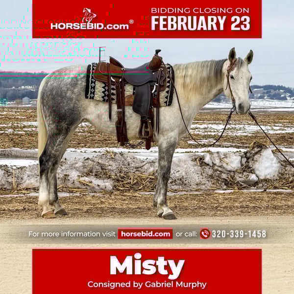 💎 𝐓𝐇𝐄 𝓓𝓲𝓪𝓶𝓸𝓷𝓭 𝐒𝐇𝐎𝐖𝐂𝐀𝐒𝐄 💎 Happening now thru MONDAY | FEBRUARY 23rd - Available EXCLUSIVELY on HorseBid's website! For more details and to register visit: www.Horsebid.com CONSIGNOR CONTACT: Gabriel Murphy 320-339-1458 LOCATION: Cannon Falls, MN BREED: Quarter horse REGISTERED: No REGISTERED NAME: Misty COLOR: Grey HEIGHT: 14.3 AGE: 9 GENDER: Mare Misty Misty is a beautiful nine-year-old grey grade mare with the kind of disposition everyone is looking for. She’s gentle, low-headed, and incredibly sweet to be around. Easy to catch, easy to handle, and always willing — she’s the type that fits right in with the whole family. Misty has done a little bit of everything. She’s been used to push cattle and load trucks at the sale barn, has spent plenty of time out on the trails, and has been hauled to 4-H and fun shows. She’s competed in barrels and poles and handles it all with a calm, steady mindset. Whether you’re riding inside the arena or out in the open, she stays the same honest, reliable mare every time you swing a leg over. In the arena, Misty takes both leads with ease, lopes a nice collected circle, has a smooth jog, and an easy, ground-covering walk. She neck reins nicely, rides around on a loose rein, and listens well to voice commands. She’s soft in the face, responsive, and forgiving — making her a great confidence builder for younger riders while still being enjoyable for an adult to ride. Out on the trail, Misty is as dependable as they come. She’ll cross water, step over fallen trees, go up and down hills, and handle rough terrain without hesitation. She’s sure-footed and not spooky, making her a trustworthy partner anywhere you point her. Misty gets along well turned out with other horses and is quiet and content in the stall. She stands tied, stands for the farrier, loads and hauls well, and handles everyday ranch life like a pro. If you’re looking for a safe, all-around mare your kids can enjoy this summer — or one you can saddle up and enjoy yourself — Misty checks all the boxes. She’s the kind that’s hard to find and even harder to let go.