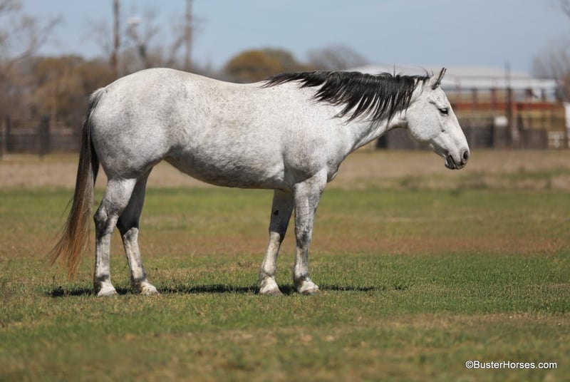ONLINE AUCTION Place your bids at www.PlatinumEquineAuction.com Starting Bid $3500 Auction ends April 20th, 2025 Need a new saddle? Check out White Rock Saddles on our website or Facebook! Ladys Cause aka Penelope, is as shapy, T-H-I-C-K, gentle, and as laid-back of a mare as you can find. This bigger than life, 14.3h, gorgeous mare has her entire life ahead of her – at the perfect, ideal, prime age of 8 years old. And it is not everybody’s guess on her age,… she is AQHA registered. This big hunk of a mare, looks like this coming straight out of the pasture from being turned out this winter! We just moved her to the fitting barn to get bloomed and shined up. She is already stunning as she is, an incredibly pretty mare – she will knock your socks off coming out of the fitting barn… this is how she looks just straight out of the pasture! She has great feet and could go barefoot or in shoes. She is great for the farrier, easy to catch, bathes, loads, hauls well, and she stands quietly to be groomed, saddled, and easy to bridle. She stands flat-footed and doesn’t move a foot for mount and dismount. She rides out alone just as well as she does with others, and she is content to go anywhere in the group – she’ll lead, or be in the middle, or fall behind at the back of the line. She is confident in new situations, and she was absolutely great in town. She loves terrain, she will tackle anything you put in front of her, and she absolutely loves the water! She rides around on a nice long relaxed rein, she is easy going and one of those that you kind of have to pedal up into a trot and a lope, she doesn’t hesitate to stop – definitely more whoa, than go. Check back on our Facebook page and our website for updates on this gorgeous mare, we are excited to see how she looks after she is legged up and in the fitting barn for a couple weeks! Please call anytime if you have any questions about her Contact Buster Horses Ashley 214-605-7174 Penelope is located in Weatherford, TX – one hour from Dallas / Fort Worth International Airport. She is an easy day trip or fun overnight trip to come try out, from anywhere! We are experienced knowledgeable sellers and we can help with quickly arranging affordable shipping to any buyer’s location – we have experience shipping horses worldwide – including regularly to Hawaii, Canada, Mexico, Europe, and South Africa. Go to our Facebook page Buster Ranch and check our website for buyer reviews, for more videos, additional info, etc: https://busterhorses.com/Ladys-Cause ONLINE AUCTION Place your bids at www.PlatinumEquineAuction.com Starting Bid $3500 Auction ends April 20th, 2025 Need a new saddle? Check out White Rock Saddles on our website or Facebook!