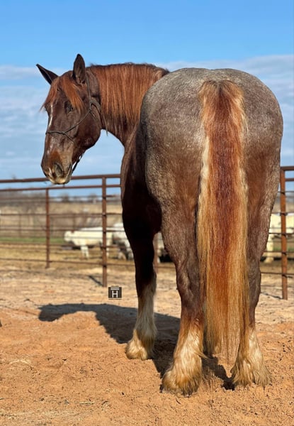ONLINE AUCTION Place your bids at www.PlatinumEquineAuction.com Starting Bid $3500 Auction ends February 3rd, 2025 Need a new saddle? Check out White Rock Saddles on our website or Facebook! Merlot is a beautiful red roan mare standing 16.2 hands tall with enough mass to pull a house down. We normally call horses like her the perfect beer drinking horse but this mare is so classy we call her a wine drinking horse. Merlot is a sweet mare that is gentle and kind. She lowers her head to be haltered and bridled. She saddles up like a lady every day and is the perfect mount to jump on and go down the trails, or hook up and drive to town. She will cross all the obstacles we have found including water, logs, brush, and mud and will go up and down even the toughest of terrain with sure footedness. She will lead, follow, or go out on her own. She loads and unloads with ease and stands tied. Merlot will stand at the mounting block, cross tie, and is good stalled or turned out. We have never seen her show any mare tendencies. She is barefoot and sound with clean/straight legs. She is a stunning mare with chrome and mass that you have to see in person to appreciate! FMI call/text Holland Horse Co Chanel 559-978-6320. We are happy to answer questions, schedule a test ride, or help arrange shipping nationwide! Located in Jacksboro, TX. ONLINE AUCTION Place your bids at www.PlatinumEquineAuction.com Starting Bid $3500 Auction ends February 3rd, 2025 Need a new saddle? Check out White Rock Saddles on our website or Facebook!
