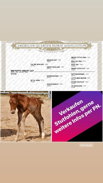 Verkaufen Fohlen, geboren am 24.03.2026 mit einem tollen Körperbau, mega Bewegung und Pedigree. Später auch für die Zucht interessant. Ratenzahlung bis zur Abholung nach dem Absetzen möglich. Kleine AKU genauso wie eine Lebensversicherung bis zur Abholung ist im Preis enthalten. „MM Pepto Smart Cat“ aka „Brunhilde“ ist eine tolle Stute mit kräftigem Knochen und Körper. Ihre Eltern stehen bei uns am Hof. Wir nehmen KEINE Schecks aus dem Ausland!! Immer aktuelle Bilder auf unserer Seite unter • www.mm-ranch.de oder unter Facebook / Instagram • M & M Ranch Videos gerne auf Anfrage.