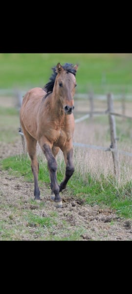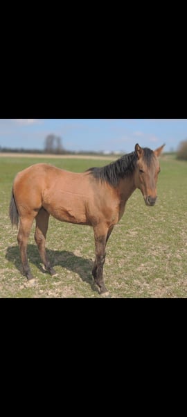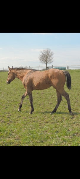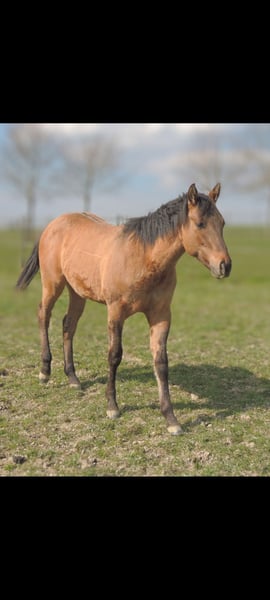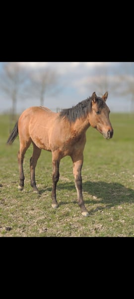QH Fohlen geboren am 6.3.2025 ! Zur Zeit ist er 146cm groß und das Endmaß liegt ca bei 156-158 cm ! Regelmäßige Wurmkuren , Impfungen und Hufschmied sind selbstverständlich ! AQHA Papiere liegen vor ! Die Fotos sind aktuell , aber er hat noch nicht das eigentliche Sommerfell ! Er wächst im Herdenverband auf und steht in großen Laufboxen wo er immer Zugang zu Heu hat ! AQHA Papiere liegen vor . Er sind 6 Penel getestet mit N/N