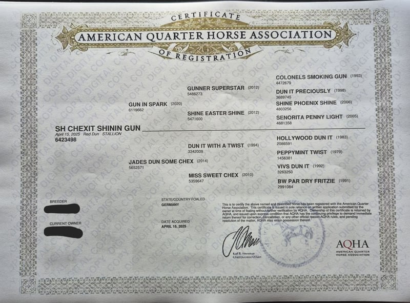 Very expressive, strong colt with an excellent pedigree - suitable for sport and of course also for ambitious leisure riders. Wide blaze. One blue eye. Estimated final height 150cm. Will learn the basics of foal training before leaving. Grows up healthy on our large Black Forest pastures, in a herd. - Stable foundation and strong bones - Good conformation - Cheeky character - Easy to handle - 5 Panel N/N via the parents - CoR AQHA and DQHA passport are applied for **Entering the yard and pastures for viewings, as well as riding the sale horses, is always at your own risk! Exclusion of any warranty! We charge €50 for trial rides of our sale horses. This amount will be deducted from the purchase price of a horse.**