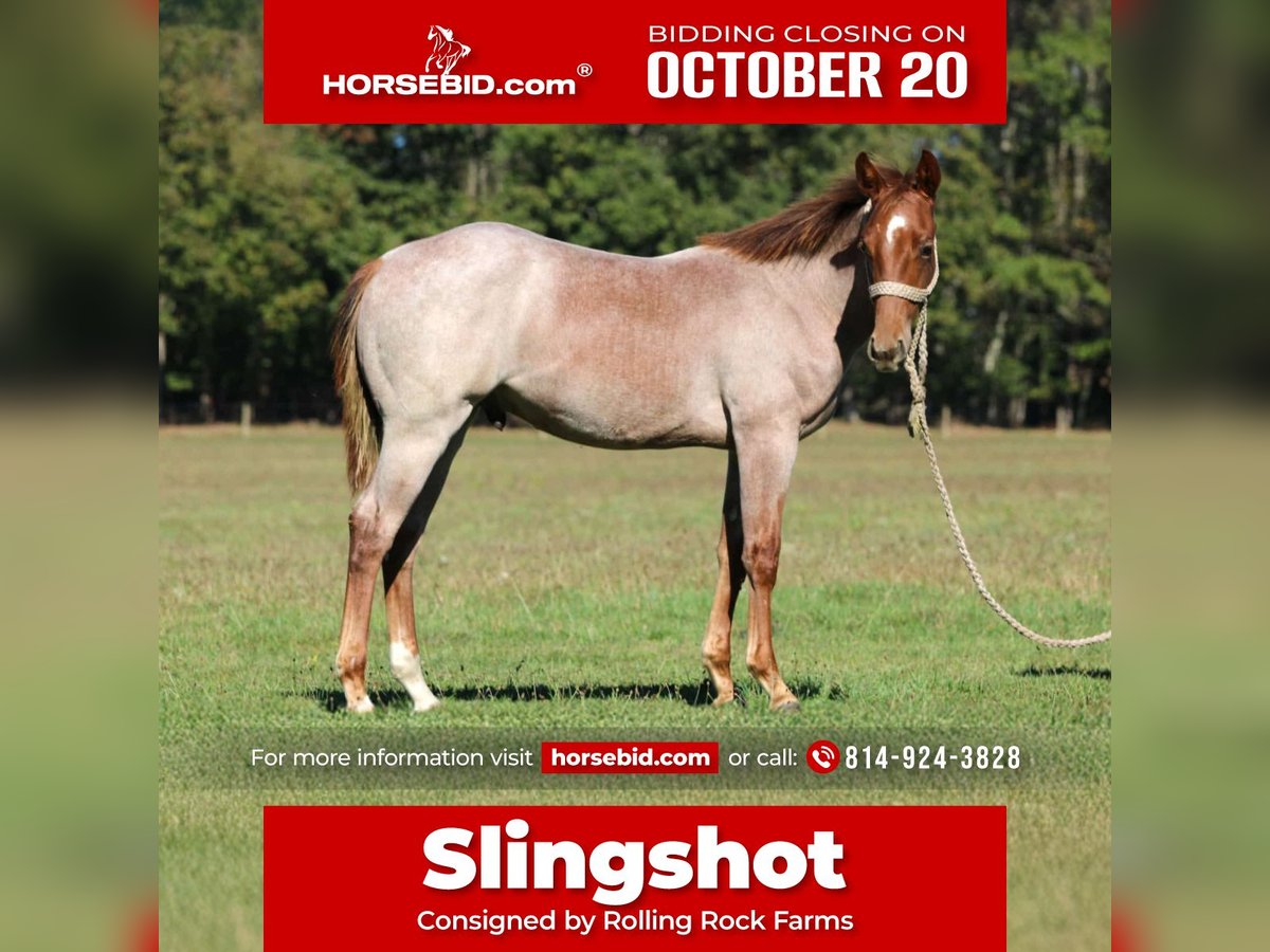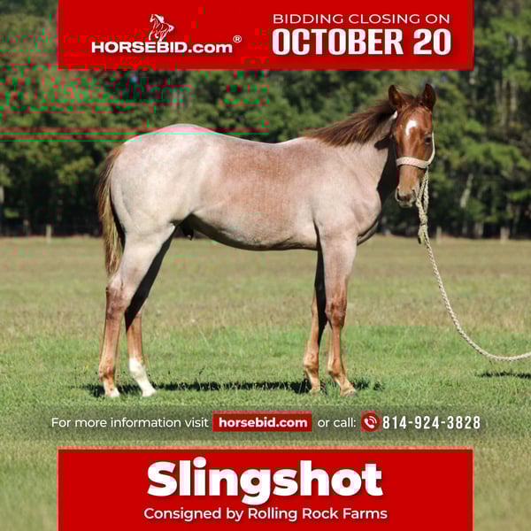 ♦️ 𝐭𝐡𝐞 𝐀𝐌𝐄𝐑𝐈𝐂𝐀𝐍 𝓕𝓪𝓵𝓵 𝓒𝓵𝓪𝓼𝓼𝓲𝓬 ♦️ Happening now thru MONDAY | OCTOBER 20th - Available EXCLUSIVELY on HorseBid's website! For more details and to register visit: www.Horsebid.com CONSIGNOR CONTACT: Rolling Rock Farms 814-924-3828 LOCATION: Miola, PA BREED: Quarter horse REGISTERED: Yes REGISTERED NAME: KMR SLINGSHOT COLOR: Red roan HEIGHT: N/a AGE: 0 GENDER: Colt KMR Slingshot is as fancy as they come — a 2025 red roan colt with pedigree, presence, and personality all wrapped into one. He’s friendly and curious, always easy to catch. Leads, ties, loads and hauls great, and hauls great, has been exposed to tarps, picks up his feet, and has been ponied. This colt has the kind of mind and foundation you want to see in a young prospect. Sired by EBC Rooey Bluey, by Hashtags (LTE $485,293, NCHA Hall of Fame, Open World Champion, Open Super Stakes Champion), and out of Smooth Little Sis, by Smooth As A Cat (2005 NCHA Horse of the Year, Hall of Fame, LTE $500,037, $31.5 Million Dollar Sire). Out of Ms Halcyon Days, a 5-panel N/N mare by Halreycious (LTE $227,459, by Dual Rey – offspring earners over $24.5 Million). The bottom side traces back to Stylish Play Lena, producer of over $2 Million, and Royal Blue Boon, NCHA’s #1 producing broodmare with progeny earnings over $2.6 Million. This colt is built right, bred right, and has the look and talent to go in any direction — show pen, ranch, or breeding program.