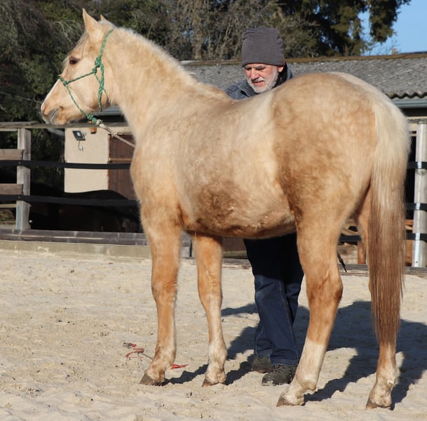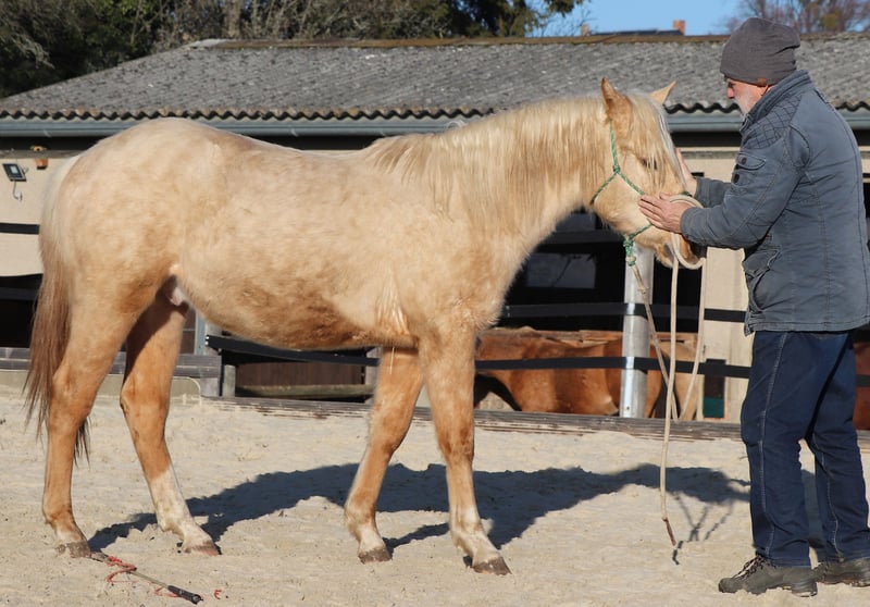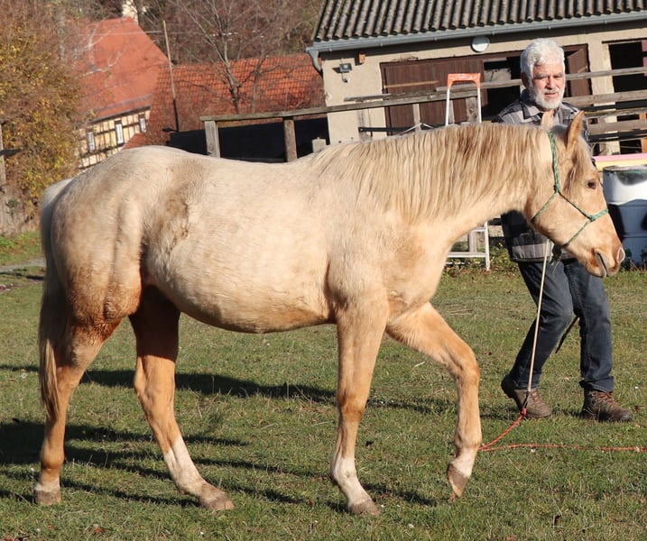 Peppy Doc King Maxen - Dieser 2024 geborene Palomino (Endmaß ca. 148 cm) mit traumhafter weißer Mähne und Schweif ist ein absoluter Eyecatcher - kompakt, korrekt gebaut und mit vielversprechenden Proportionen. Ein Nachwuchspferd, das nicht nur durch seine Optik, sondern auch durch seinen tollen Charakter überzeugt. Er ist menschenbezogen, freundlich, aufmerksam und lernwillig. Im täglichen Umgang zeigt er sich artig, entspannt und unkompliziert. Herausforderungen begegnet er mit Mut und Neugier und lernt schnell. Schon jetzt lässt er sich problemlos verladen und geht ruhig und gelassen an der Hand ins Gelände. Der Hengst wächst gesund und robust im Offenstall in gemischter Herde auf und wird liebevoll und mit viel Sachverstand an seine Aufgaben als Reitpferd herangeführt - nach den Prinzipien des Natural Horsemanship, Schritt für Schritt und ohne Zeitdruck. Die Farbgenetik (e/e, A/a, CH/ch) macht ihn nicht nur farblich besonders interessant, sondern eröffnet auch züchterisch Potenzial. Peppy ist altersgemäß geimpft und regelmäßig entwurmt. Seine Abstammung lässt keine Wünsche offen: Top Cuttinglinien (Enkel von Peptoboonmal) väterlicherseits treffen auf ausgezeichnete Reiteigenschaften mütterlicherseits - eine ideale Kombination für Sport, Turnier und Freizeit. Der Hengst ist DQHA sowie Regional-Futurity startberechtigt und bringt alles mit, um in Zukunft ein vielseitig einsetzbares Reitpferd mit Charme, Talent und Herz zu werden.
