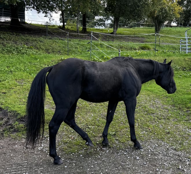To reduce our stock, we are offering our beautiful, good-natured stallion for sale. He lives in a species-appropriate pasture environment and has constant contact with young stallions. The stallion is healthy, well-trained, and ready for new challenges. He has contact with children and dogs. He has been regularly seen by the veterinarian, vaccinated, and dewormed. Jack is barefoot and behaves very well with the farrier. Jack comes from a good lineage. His father, Thee Final One, is an AQHA Champion and World Champion Qualifier.