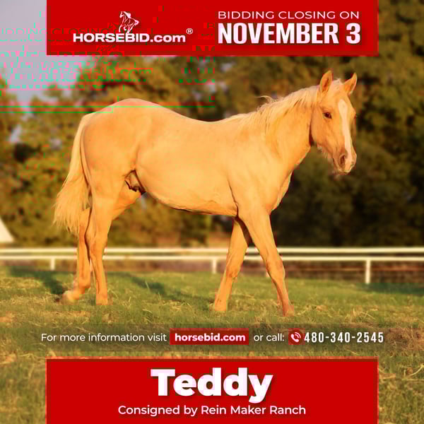 ⚜️𝐓𝐇𝐄 𝐅𝐀𝐋𝐋 𝐇𝐄𝐑𝐈𝐓𝐀𝐆𝐄 𝐂𝐋𝐀𝐒𝐒𝐈𝐂⚜️ Happening now thru MONDAY | NOVEMBER 3rd - Available EXCLUSIVELY on HorseBid's website! For more details and to register visit: www.Horsebid.com CONSIGNOR CONTACT: Rein Maker Ranch 480-340-2545 LOCATION: Wayne, OK BREED: AQHA REGISTERED: Yes REGISTERED NAME: Wimpy Vintage Magnum COLOR: Palomino HEIGHT: 13 AGE: Weanling GENDER: Colt Wimpy Vintage Magnum ✨ Golden Opportunity – Palomino Colt ✨ NRBC Nominated • NRHA Enrolled • 100X Eligible This stunning palomino weanling colt is the total package — pedigree, presence, and performance potential all in one golden coat. Sired by Wimpys Little Colonel, a proven son of Wimpys Little Step, and out of a mare by A Sparkling Vintage out of a Magnum Chic Dream mare, this colt is bred to excel in the show pen. Teddy is halter broke, easy to be around and has the looks to make him the full package. NRHA, NRBC, and 100X Reining, he’s a top-notch futurity prospect and a smart investment for any serious reining program.