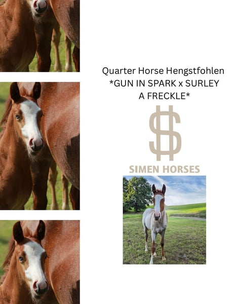 Fine colt with blue eyes. Absolute eye-catcher. Top pedigree - suitable for sports and of course also for ambitious leisure riders. Estimated final height 150cm. Learns the basics of foal training until weaning. Grows up healthy on our large Black Forest pastures, in a herd environment. - Stable foundation and strong bones - Good conformation - Calm character - Easy to handle - 5 Panel N/N through the parents - CoR AQHA and DQHA passport applied for **Entering the yard and pastures of the establishment for viewings as well as riding sale horses is always at your own risk! Exclusion of any warranty! We charge €50 for trial rides of our sale horses. This amount will be deducted from the purchase price of a horse.**