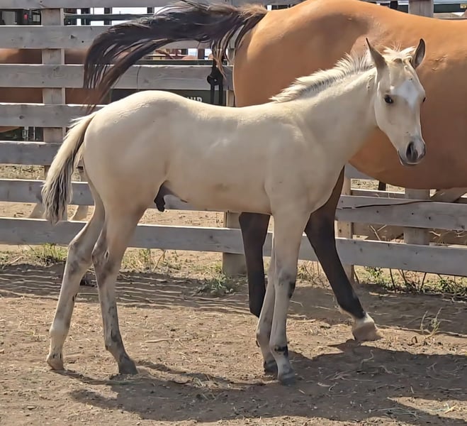WOW!!! Absolute future Stallion!!! This guy was born a near white palomino which was very different. He was the color of a cremello with a snow-white mane and tail. Now his markings are quickly turning black, making him a very light buttermilk buckskin. His confirmation and muscling is absolutely incredible. This is a rare gem that we have NEVER seen before. TOPAZ will be on the cover of horse magazine someday. He is just that good. As a stallion he will make a lasting mark on any breeding program or as a high visibility show gelding. Horses do not get any better than this World Class young stallion. Show Horse, he will be unstoppable.