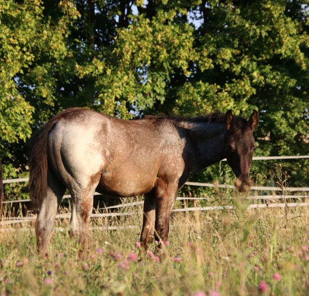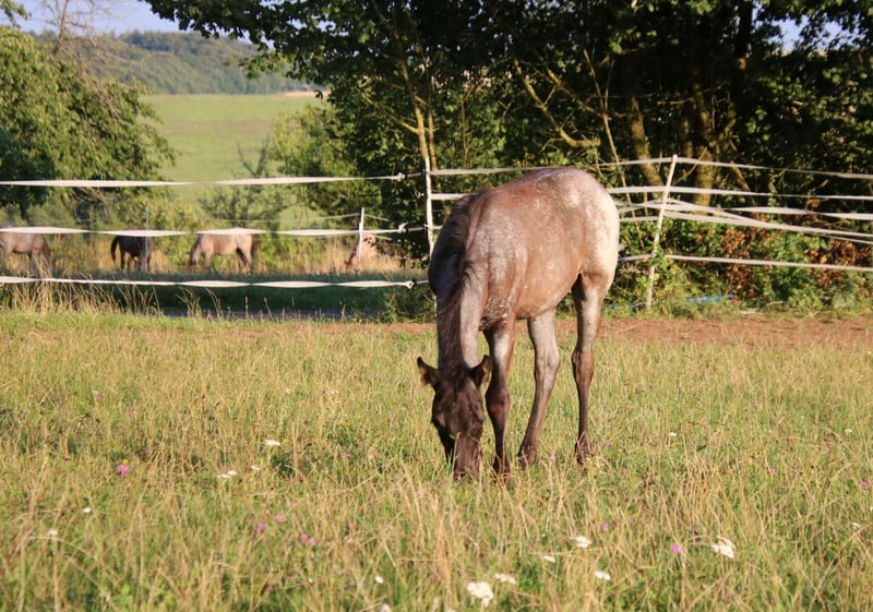 Just Be Blue Sky - dieses bildhübsche Quarter Horse Hengstfohlen, geboren am 9.4.2025, beeindruckt in der auffälligen Farbe Blue Roan und wird voraussichtlich ein Endmaß von 150 bis 154 cm bekommen. Blue ist über seine Eltern 5-Panel n/n. Er wächst gesund und artgerecht im Herdenverband mit anderen Fohlen auf. Bei Abgabe wird er altersgemäß geimpft und entwurmt sein. Kennt dann den Tierarzt und den Hufschmied. Mit seinem lieben Charakter verzaubert er die Umwelt. Ist verschmust sowie cool und erkundigt gerne seine Umwelt. Blue wird täglich gehändelt und benimmt sich dabei brav und unkompliziert. Beim Toben zeigt er jetzt schon seine tollen Bewegungen. Dank seiner guten Allround Abstammung wird er sich voraussichtlich sehr gut für den Sport oder/und als treuen Freizeitbegleiter eignen. Wird mit vollen AQHA Papieren und Equiden Pass abgegeben.