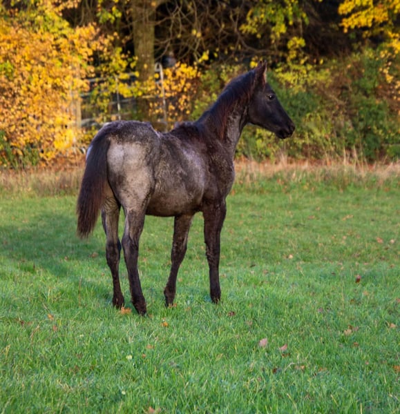 Just Be Blue Sky - dieses bildhübsche Quarter Horse Hengstfohlen, geboren am 9.4.2025, beeindruckt in der auffälligen Farbe Blue Roan und wird voraussichtlich ein Endmaß von 150 bis 154 cm bekommen. Blue ist über seine Eltern 5-Panel n/n. Er wächst gesund und artgerecht im Herdenverband mit anderen Fohlen auf. Bei Abgabe wird er altersgemäß geimpft und entwurmt sein. Kennt dann den Tierarzt und den Hufschmied. Mit seinem lieben Charakter verzaubert er die Umwelt. Ist verschmust sowie cool und erkundigt gerne seine Umwelt. Blue wird täglich gehändelt und benimmt sich dabei brav und unkompliziert. Beim Toben zeigt er jetzt schon seine tollen Bewegungen. Dank seiner guten Allround Abstammung wird er sich voraussichtlich sehr gut für den Sport oder/und als treuen Freizeitbegleiter eignen. Wird mit vollen AQHA Papieren und Equiden Pass abgegeben.