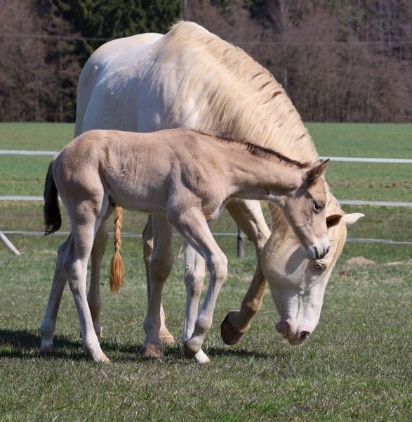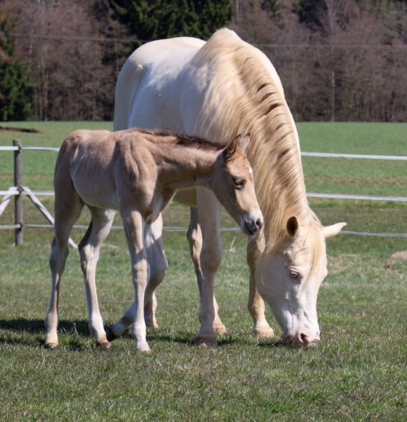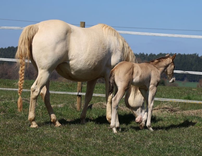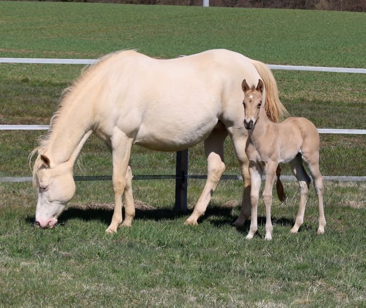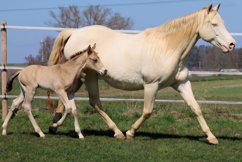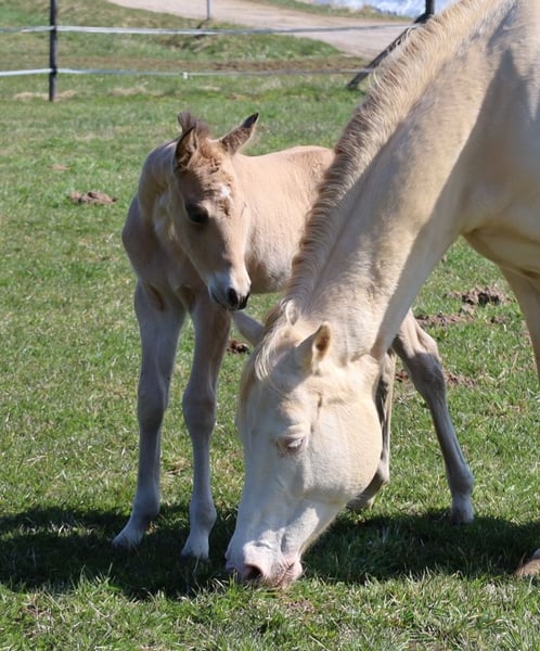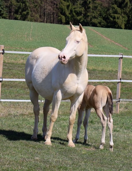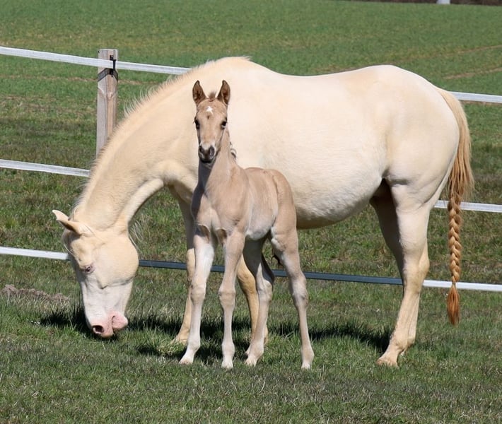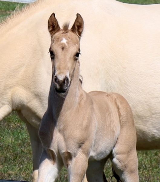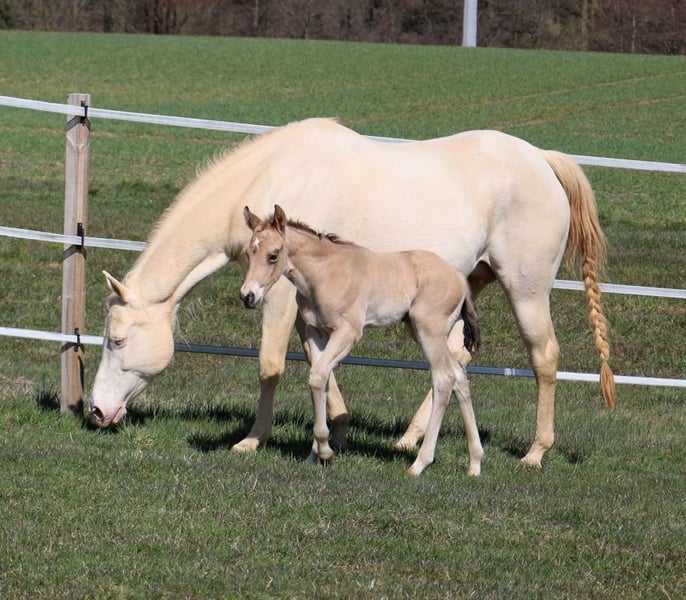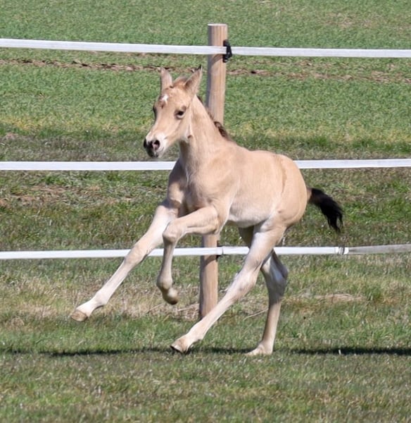 MADOXX PLATINUM KING, geb. 28.03.2026, buckskin (auf den Bildern 5 Tage alt). Bildhübsches, sehr typvolles, wirklich stabiles und ganz korrekt gebautes Hengsfohlen aus der bewährten Anpaarung „Hesa Blackberry King“ aus der „Hollywood Powergirl“. In seinem Pedigree findet man Namen wie Hollywood Dun It, Fritz Power, Doc Chex, Gray Starlight, Smart Little Lena, King P-234 uvm. Damit dürfte ihm das Talent für Reining, Trail und die Ranch Horse-Klassen uvm. in die Wiege gelegt worden sein. Seine Geschwister laufen bereits sehr erfolgreich auf Turnieren in den verschiedenen Disziplinen. Mit seinem liebenswerten Charakter wird er bestimmt auch ein treuer Freizeitpartner werden, mit dem man jede Menge Spaß haben kann. Er wird mit seinenGeschwistern in der Herde aufwachsen, sachkundig aufgezogen und natürlich wird er bei Übergabe alles kennen, was ein Pferdekind in diesem Alter kennen sollte. Bei entsprechender Förderung und Weiterentwicklung wäre er evtl. auch für die Zucht interessant. Regelmäßige Wurmkuren und Hufschmied sind bei uns eine Selbstverständlichkeit. Sein AQHA-Papier ist bereits beantragt und auf dem Postweg zu uns, in Kürze wird er gechipt und der DQHA-Equidenpass incl. Zuchtbescheinigung beantragt. 5-Panel-Test N/N. Bei Verkauf wird er lebensversichert, Kosten und Risiko bleiben bis zur Übergabe bei uns. Seine Eltern und einige seiner Geschwister, die auch schon hocherfolgreich im Turniersport unterwegs sind, sind bei uns auf dem Hof zu besichtigen. Einzahlung in die verschiedenen Programme möglich, wie z.B. EWU-Jungpferdeprogramm, NSBA, NRHA usw. Ein unverbindlicher Besuch ist jederzeit möglich - einfach kurz anrufen, Tel. 0170/4443194. Die letzten zwei Bilder sind sein Papa, unsere Hesa Blackberry King. Ein weiteres Quarter Horse Stutfohlen, buckskin, geb. 16.02.206 steht zum Verkauf - siehe Homepage www.goetz-quarterhorse.de