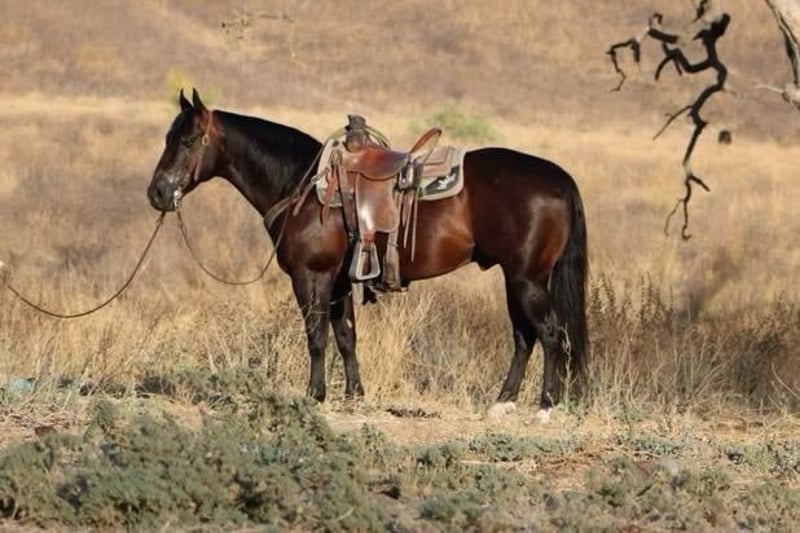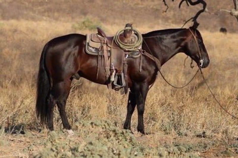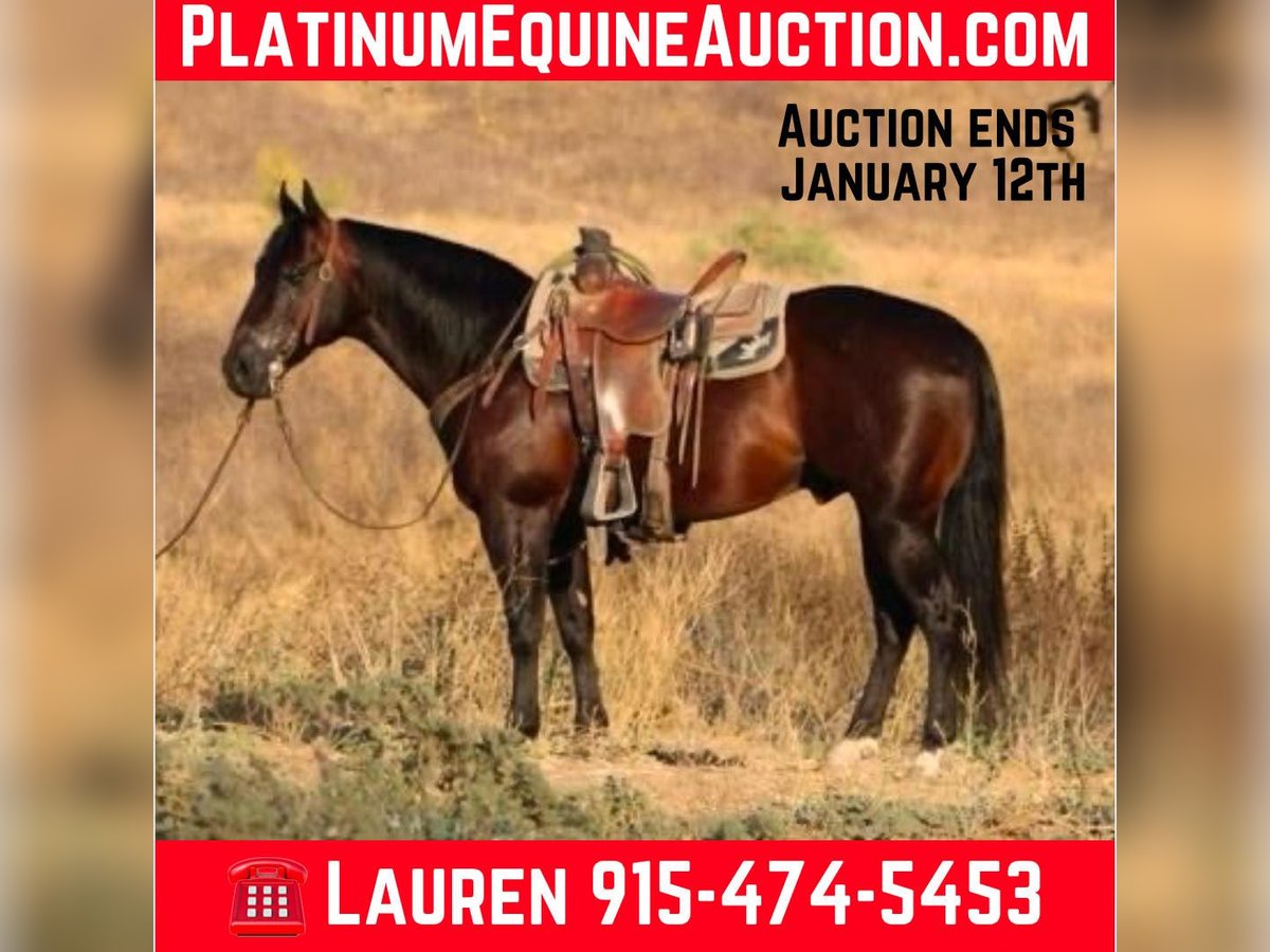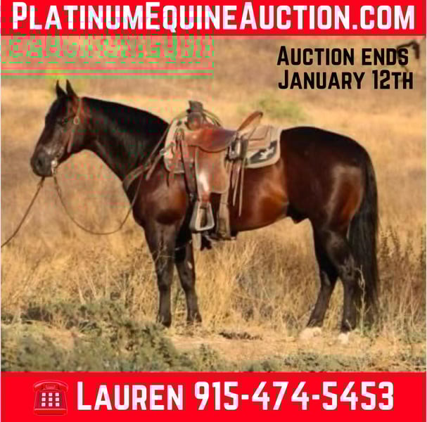 ONLINE AUCTION Place your bids at www.PlatinumEquineAuction.com Starting Bid $3500 Auction ends January 12th, 2024 Need a new saddle? Check out White Rock Saddles on our website or Facebook! Califa is the absolute kid horse! He’s SAFE SAFE SAFE! He has been the baby sitter around our place we bring him out for all the kids and beginners. From trail riding down the road or giving rides at the family parties he’s our go to. Califa is 8 years old he stands 14’2 h tall he’s built like a like bulldog quarter horse short, stocky, big hip with a little head. He’s got the coolest dark bay color with a long mane and tail that touches the ground and a kind dark eye. We’ve used him also on the ranch from rounding cows up or pushing steers up at the roping practices. He has also been rode in the arena on the heel side, he’s good in the box we’ve roped medium steers and roped the smarty. He knows his leads, he will lope big pretty circles. He’s been around the barrels, flags, tarps, traffic, he’s absolutely safe for any level rider will be safe everyday of the week and 100% reliable. Califa is easy to shoe, saddle , bathe , load and haul with no issues. He will be straight legged no bumps or blemishes and 100% sound. If you are looking for your next family horse Califa is your guy don’t miss him. Contact Lauren Lara 915-474-5453. Located in El Paso, TXX. ONLINE AUCTION Place your bids at www.PlatinumEquineAuction.com Starting Bid $3500 Auction ends January 12th, 2024 Need a new saddle? Check out White Rock Saddles on our website or Facebook!