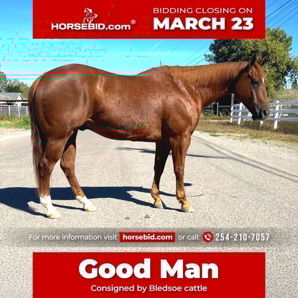 ⚜️𝓽𝓱𝓮 𝐆𝐎𝐋𝐃 𝓢𝓮𝓵𝓮𝓬𝓽⚜️ Happening now thru MONDAY | MARCH 23rd - Available EXCLUSIVELY on HorseBid's website! For more details and to register visit: www.Horsebid.com CONSIGNOR CONTACT: Bledsoe Cattle 254-210-7057 LOCATION: Queen Creek, AZ BREED: Qh REGISTERED: Yes REGISTERED NAME: NOTTA ROAN HOLDER COLOR: Sorrel HEIGHT: 14.3 AGE: 10 GENDER: Gelding Good Man is a ten year old sorrel gelding with a very kind and willing disposition. He has been used extensively on the ranch and working cattle. He will stride out and trot all day and when the job is done he will drop his head and walk home. Not only is he one you can trust to work on he is a well seasoned heel horse. Has been hauled to rodeos jackpots and everything in between. No buck pull back or funny business on the ground. Easy to clip and wash. I keep him on previcox when using him extensively.