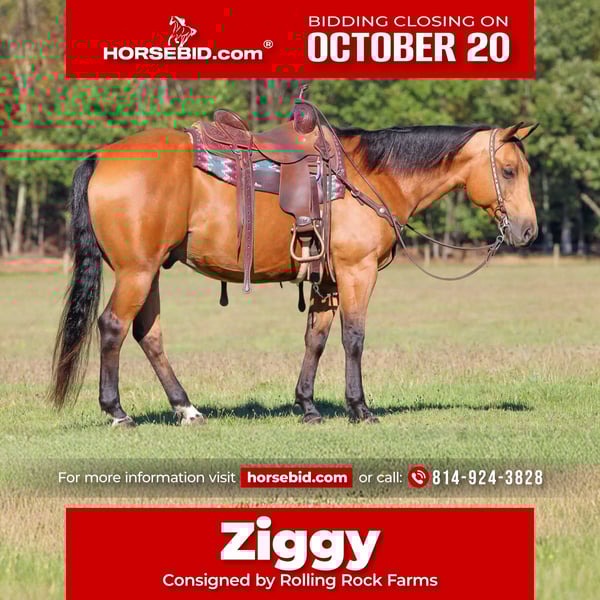 ♦️ 𝐭𝐡𝐞 𝐀𝐌𝐄𝐑𝐈𝐂𝐀𝐍 𝓕𝓪𝓵𝓵 𝓒𝓵𝓪𝓼𝓼𝓲𝓬 ♦️ Happening now thru MONDAY | OCTOBER 20th - Available EXCLUSIVELY on HorseBid's website! For more details and to register visit: www.Horsebid.com CONSIGNOR CONTACT: Rolling Rock Farms 814-924-3828 LOCATION: Miola, PA BREED: Quarter horse REGISTERED: No COLOR: Buckskin HEIGHT: 14.3 AGE: 9 GENDER: Gelding Ziggy is a 9-year-old buckskin Quarter Horse gelding standing 14.2 hands tall. He’s the kind everyone notices with his beautiful golden coat, kind eye, and balanced build that turns heads wherever he goes. Ziggy is the total package. broke, gentle, versatile, and always willing to please. He’s the kind of horse you can enjoy in the arena one day and take down the trail the next with complete confidence. In the arena, Ziggy rides around collected and soft in the bridle, holding a pretty headset at all gaits. He moves easily off leg pressure, pivots on his hind end, and has a true one hand neck rein. He catches both leads, transitions smoothly, and lopes off with ease every single time. Ziggy has also been ridden English and will trot through poles and small obstacles quietly and willingly. He’s been lightly loped through the barrel pattern and shows the kind of mind that could go in any direction such as ranch riding, playdays, or just a reliable all around partner. Out on the trail, Ziggy is solid, dependable, and sure footed. He’s been ridden through all kinds of terrain and doesn’t hesitate or spook. He will go out alone or with a group and is the same horse every ride, calm, confident, and ready to go wherever you point him. He’s seen big farm equipment, dogs, and goats. Ziggy has even carried the American flag and been used to pony colts, showing his steady nature and good attitude. He’s the kind that can go all day and still meet you at the gate with his ears up and that friendly, loving personality. Ziggy is great to be around on the ground as well. He’s extremely gentle and in your pocket, always happy to come up to you in the pasture, especially if you shake a grain bucket. He stands quietly in the cross ties to be saddled, bathed, and groomed, and has excellent manners. In the pasture, he’s lower to middle in the pecking order and does equally well kept in a stall or turned out on pasture. He is currently wearing four shoes and sells with a current negative Coggins and rabies vaccination. If you’re looking for a broke, beautiful, and trustworthy gelding that’s just as good in the arena as he is out on the trail, Ziggy checks every box. He’s the kind you’ll look forward to riding every single day. If you would like to check out Ziggy or have any questions please feel free to contact Ethan at (814) 924-3828