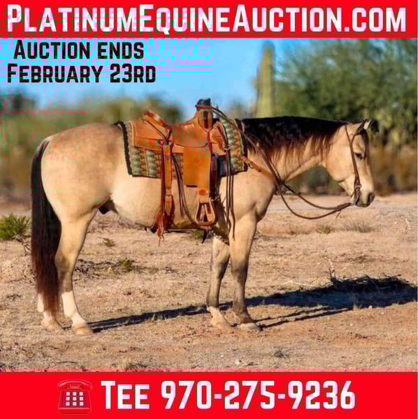 ONLINE AUCTION Place your bids at www.PlatinumEquineAuction.com Starting Bid $3500 Auction ends February 23rd, 2025 Need a new saddle? Check out White Rock Saddles on our website or Facebook! Meet Simba, your next four-legged partner in crime. This 9-year-old buckskin gelding stands at a solid 14.3 hands and brings a calm, steady presence to any job you throw his way. Whether he’s been working the branding pen or doctoring sick calves on the ranch, Simba is the epitome of reliability and heart. Not just a worker, he’s also the perfect companion for riders of all levels, offering a confidence-boosting ride whether you’re out on the trail or just enjoying a day in the saddle. Safe, steady, and all-around dependable—Simba is the kind of horse that makes you feel like you’re in good hands. Simba has been hauled to town, the mountains, the lakes and all over the desert of Arizona. He is the same horse everywhere he goes and never gets heightened. Simba is accustomed to the ropings and has been flagged on numerous times. Call us today to come take him for a spin, LT Elite Geldings Tee 970-275-9236. Located in Casa Grande, AZ. ONLINE AUCTION Place your bids at www.PlatinumEquineAuction.com Starting Bid $3500 Auction ends February 23rd, 2025 Need a new saddle? Check out White Rock Saddles on our website or Facebook!