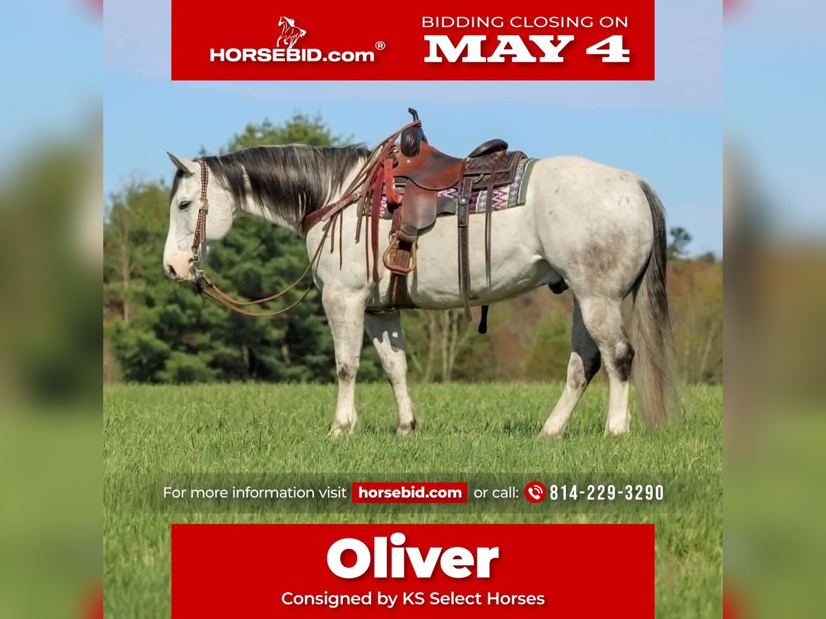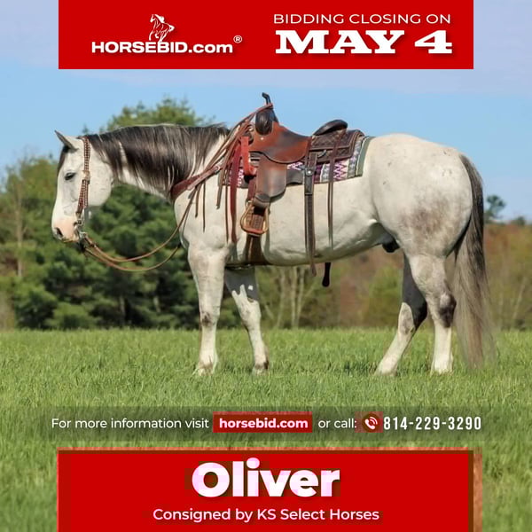 ▪️▫️◾️𝐭𝐡𝐞 𝑴𝒂𝒚 𝐒𝐞𝐥𝐞𝐜𝐭◾️▫️▪️ Happening now thru MONDAY | MAY 4th - Available EXCLUSIVELY on HorseBid's website! For more details and to register visit: www.Horsebid.com CONSIGNOR CONTACT: KS Select Horses 814-229-3290 LOCATION: Clarion, PA BREED: QH REGISTERED: Yes REGISTERED NAME: Oliver COLOR: Grey HEIGHT: 15 AGE: 10 GENDER: Gelding Oliver is a 10 Year Old Grey Quarter Horse Gelding. Standing 15 hands tall and has a nice stocky built to him. Oliver is a very nice all around good broke gelding that can do any job and do it well. He is a finished ranch horse that can do any job on the ranch and is very seasoned and been there and done that type of horse when it comes to working with cattle. Lately we have been using him a lot for trail riding. Oliver is a trail horse deluxe! Sure footed and goes any where you point him to go on the trail . Mud, Creeks, River, Logs handles it all with ease. We have rode him on the highway and into town. He is one of the best trail horses we have had . He is very well trained with a nice one hand neck rein, good stop and back up and side pass. Ride him with a rope around his neck and no bridle he is that good broke. He also rides very nicely in the arena and could go English or Western. Very friendly and loves attention and good for the farrier and vet. He is a very easy horse to ride and easy to be around on the ground. Super Nice All Around Gelding That Can Go In Any Direction! Oliver just recently had a health exam on 4-19-26. We can help arrange delivery anywhere in the United States. Call or Text Kris at 814-229-3290. Thank You and God Bless